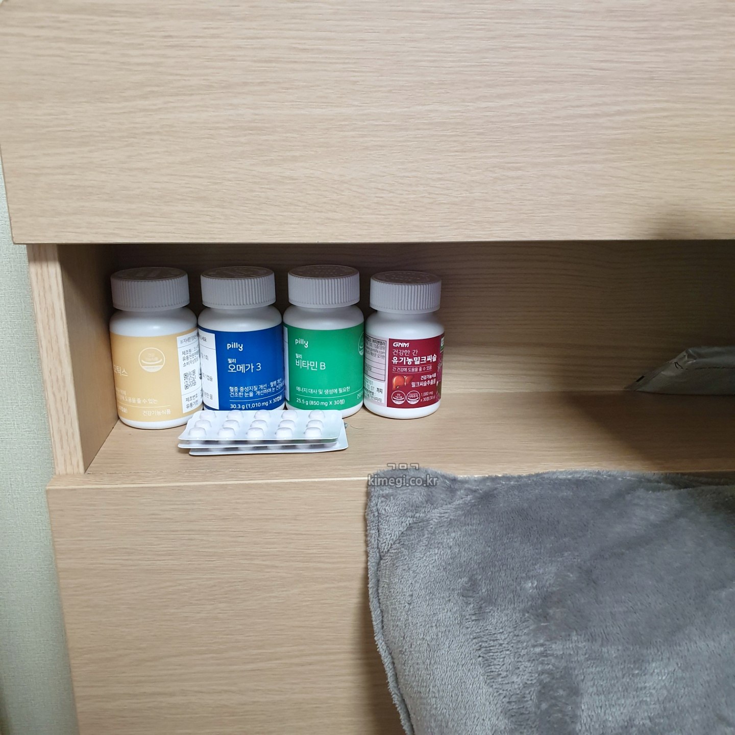 침대 위에 기존에 먹던 약들과 함께 놓고 매일 까먹지 않고 먹고 있어요. 하루에 약 5개씩을 먹어야 해서 많긴 하지만 약을 먹으면서 물도 많이 마시게 되어 좋은 것 같아요.