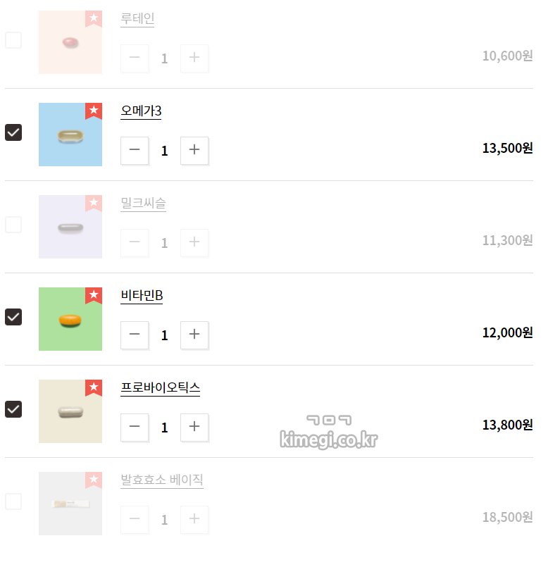 이미 구매해놓은 밀크씨슬을 제외하고 오메가3, 비타민B, 프로바이오틱스를 구매했어요. 원래는 루테인을