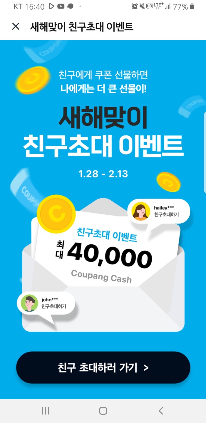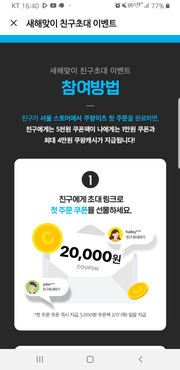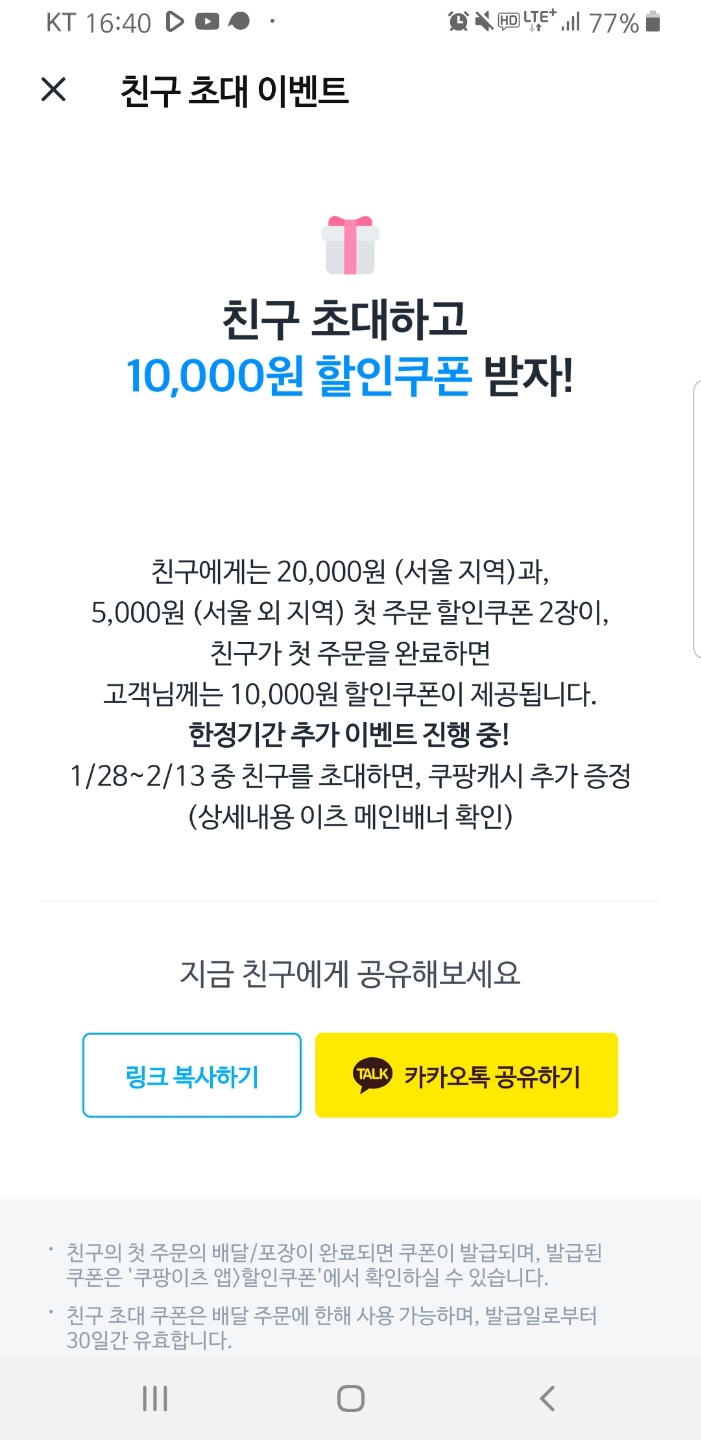 이렇게 큰 이벤트를 하는 이유가 바로 신규 가입자를 유치하려는 마케팅입니다. 신규고객 뿐만 아니라 친구를 추천한 추천인에게도 1만 원의 쿠폰을 줍니다.