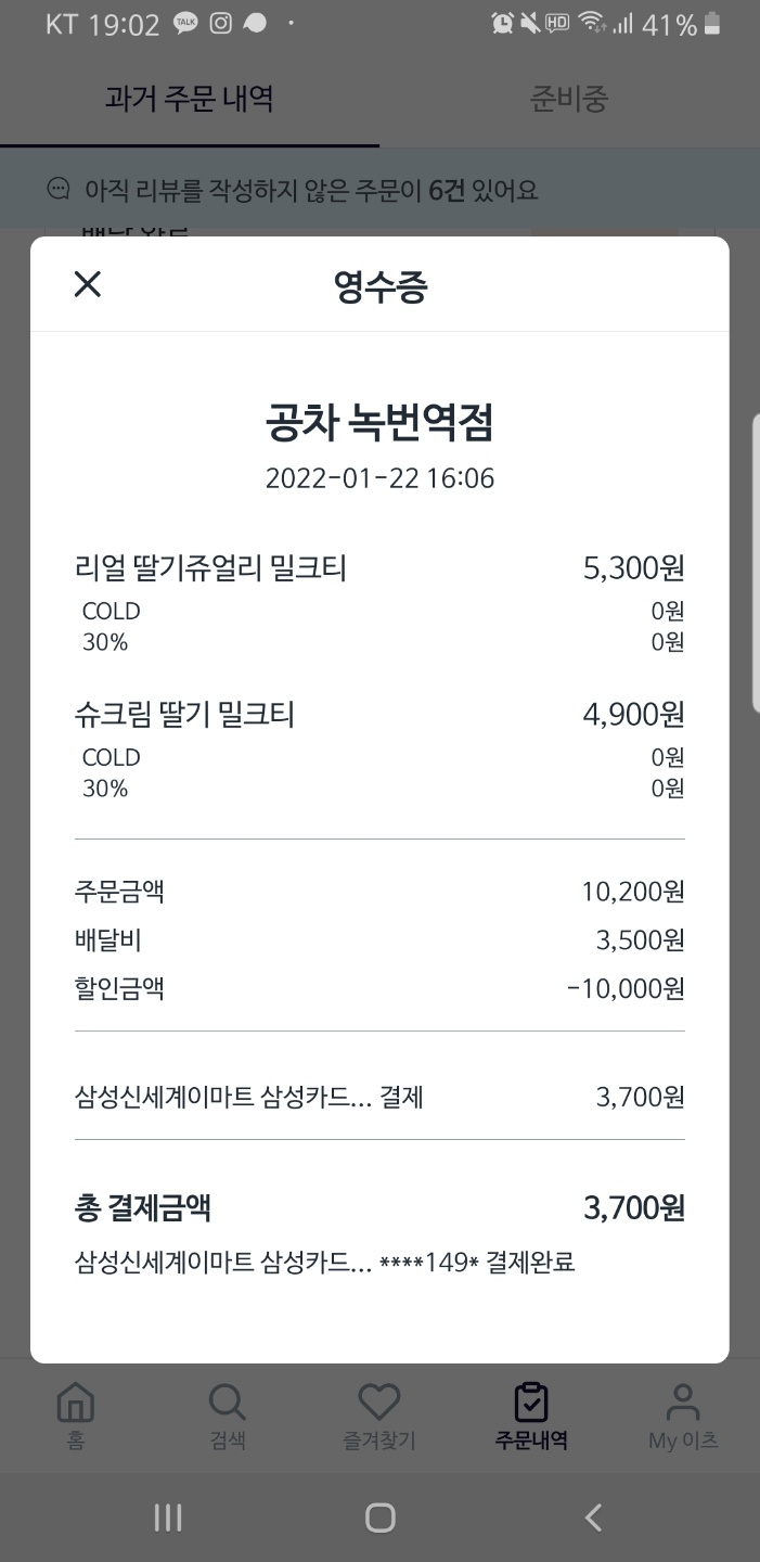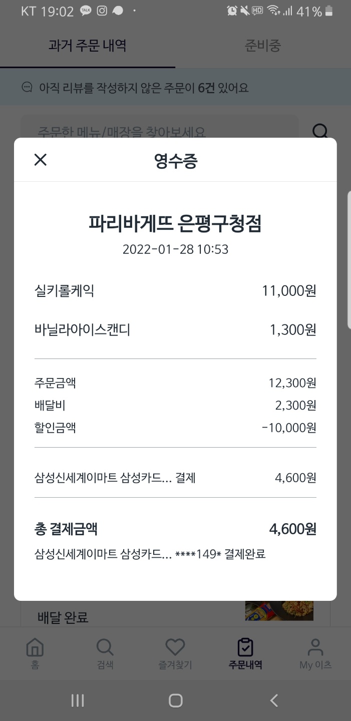 저는 이 방법을 통해서 정말 저렴하게 배달음식을 주문하고 있어요. 아래 영수증을 보면 1만원 할인쿠폰을 이용해서 몇천 원 밖에 결제를 하지 않았습니다. 요즘 정말 빠져있는 파리바게트 롤케이크와 아이스크림을 4600원에 구매했어요.