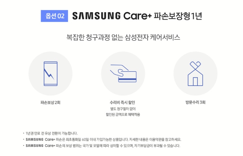 그리고 1년동안 SAMSUNG CARE 파손 보장형을 받을 수 있습니다. 파손 보상 및 수리비 할인과 방문수리 3회를 제공합니다. 그리고 다양한 카드 혜택도 있어서 실제 구매 체감 가는 더 낮아질 것 같아요.