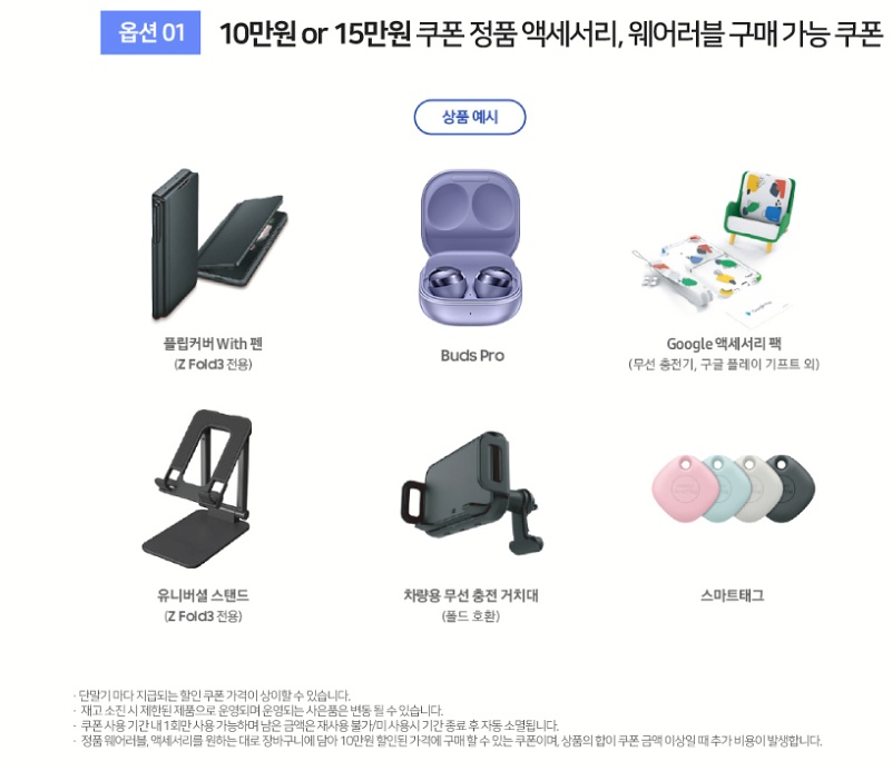 S22 사전예약을 하면 아래 두가지 옵션을 혜택으로 받을 수 있습니다. 이 사전예약 혜택 때문에 남들보다 조금 더 저렴하게 핸드폰을 구매한다는 느낌을 받을 수 있습니다. 일단 15만 원 상당의 삼성 정품 웨어러블을 구매 가능한 쿠폰을 줍니다.