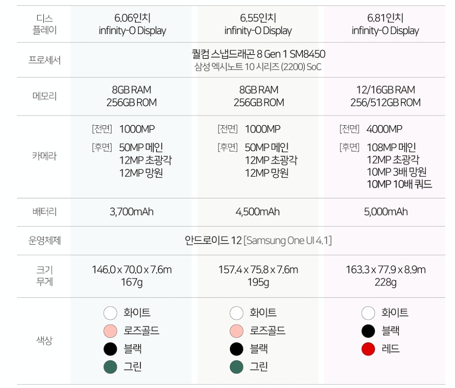 그밖에 갤럭시 S22 시리즈의 성능은 아래 표를 참고하세요.