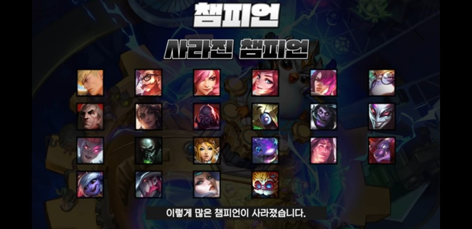 사라진 챔피언으로는 가렌, 그레이브즈, 카타리나, 럭스, 요네, 스웨인, 사미라, 사이온, 리산드라, 문도, 샤코, 아칼리, 유미, 우르곳, 잔나, 코그모, 타릭, 트리스타나, 트위스트 페이트, 트런들, 피오라, 하이머딩거가 사라졌습니다.