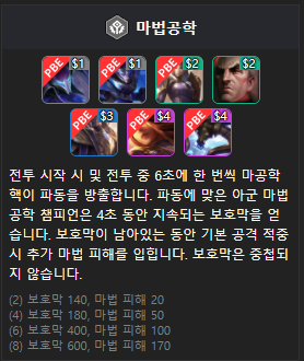 마법공학 시너지에는 7가지 챔피언이 포함되어 있습니다. 1 코스트로 녹턴과 자르반, 2 코스트로 세주아니와 스웨인, 3 코스트로 루시안, 4 코스트로 알리스타와 시비르입니다. 마법 공학은 전투 시작 시부터 6초에 한 번씩 파동을 방출합니다. 마법 공학 파동에 맞은 아군 마법 공학 챔피언은 4초 동안 지속되는 보호막을 얻고 보호막이 유지되는 동안 기본 공격에 추가 마법피해가 더해집니다.