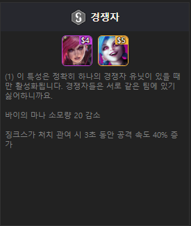 기존의 자매 시너지에서 경쟁자 시너지로 바뀌었습니다. 전 시즌에서는 징크스와 바이를 같이 사용할 때 좋았다면 지금은 따로 사용할 때 좋은 시너지입니다.