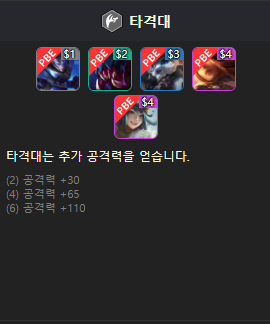타격대 챔피언으로는 1코스트 자르반, 2 코스트 렉사이, 3 코스트 나르, 4 코스트 시비르와 이렐리아가 있습니다. 타격대는 추가 공격력을 획득합니다.