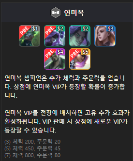 연미복 챔피언으로는 1코스트 브랜드, 2 코스트 레오나, 3 코스트 신드라와 탈론 4 코스트 드레이븐, 5 코스트 제리가 있습니다. 연미복 챔피언은 추가 체력과 주문력을 얻습니다. 그리고 상점에서 연미복 VIP가 등장하는데 VIP 연미복 챔피언은 연미복 시너지가 활성화되었을 때 추가 고유 효과가 활성화됩니다.