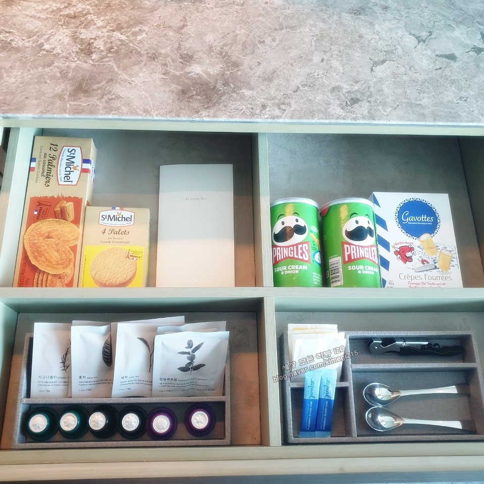 방에 들어오면 직원분이 웰컴 티를 준비해 줍니다. 시그니엘만을 위한 차와 다과로 따뜻한 방에서 바다를 보면서 오늘 하루를 계획해 봅니다. 휴식을 하러 호텔에 왔기 때문에 오늘 하루는 저녁 먹을 때 이외에는 호텔을 나가지 않을 생각이에요. 그렇다고 한가한 게 아니에요. 호텔에서 누려야 할 것들이 많아서 시간이 부족합니다.