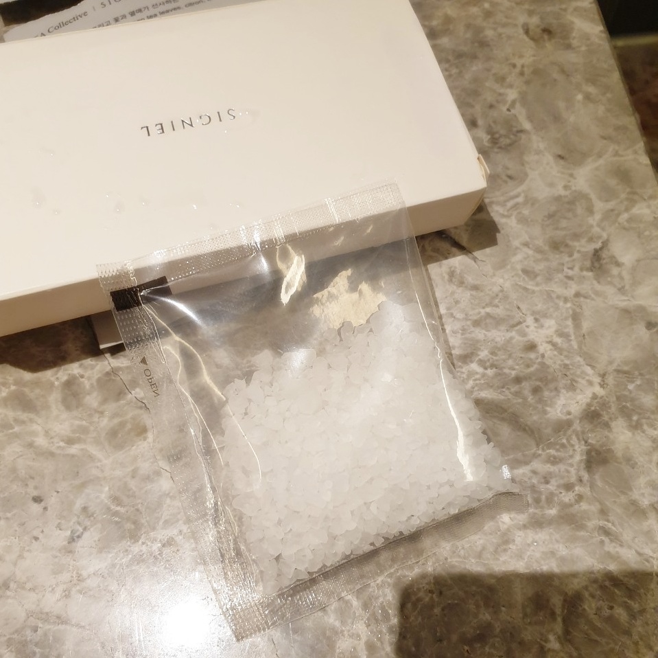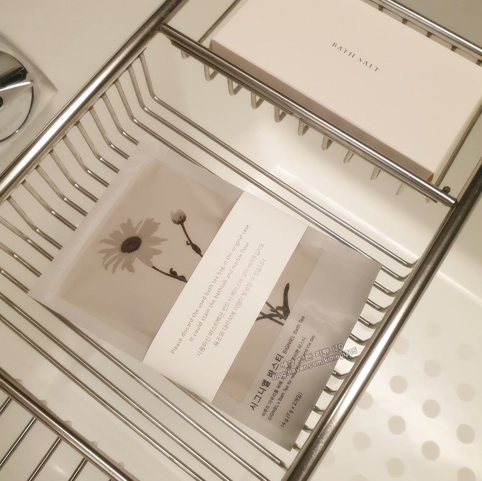 욕조에는 입욕제와 소금이 준비되어 있어 자기 전에 따뜻하게 목욕을 즐길 수 있었어요. 직원분도 좋은 제품이라고 꼭 체험하라고 하더라고요.