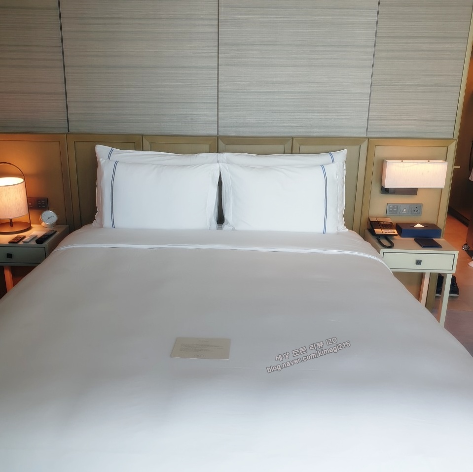 침대는 2인이 눕기에 딱 적당한 크기였습니다. 해운대 시그니엘은 베개의 높이도 원하는 대로 교체할 수 있다고 해요. 저는 귀찮아서 교체를 하지 않았는데 자다 보니까 낮은 베개가 불편하더라고요. 근데 귀찮아서 그냥 잤어요. 미리 누워보고 교체해보세요.