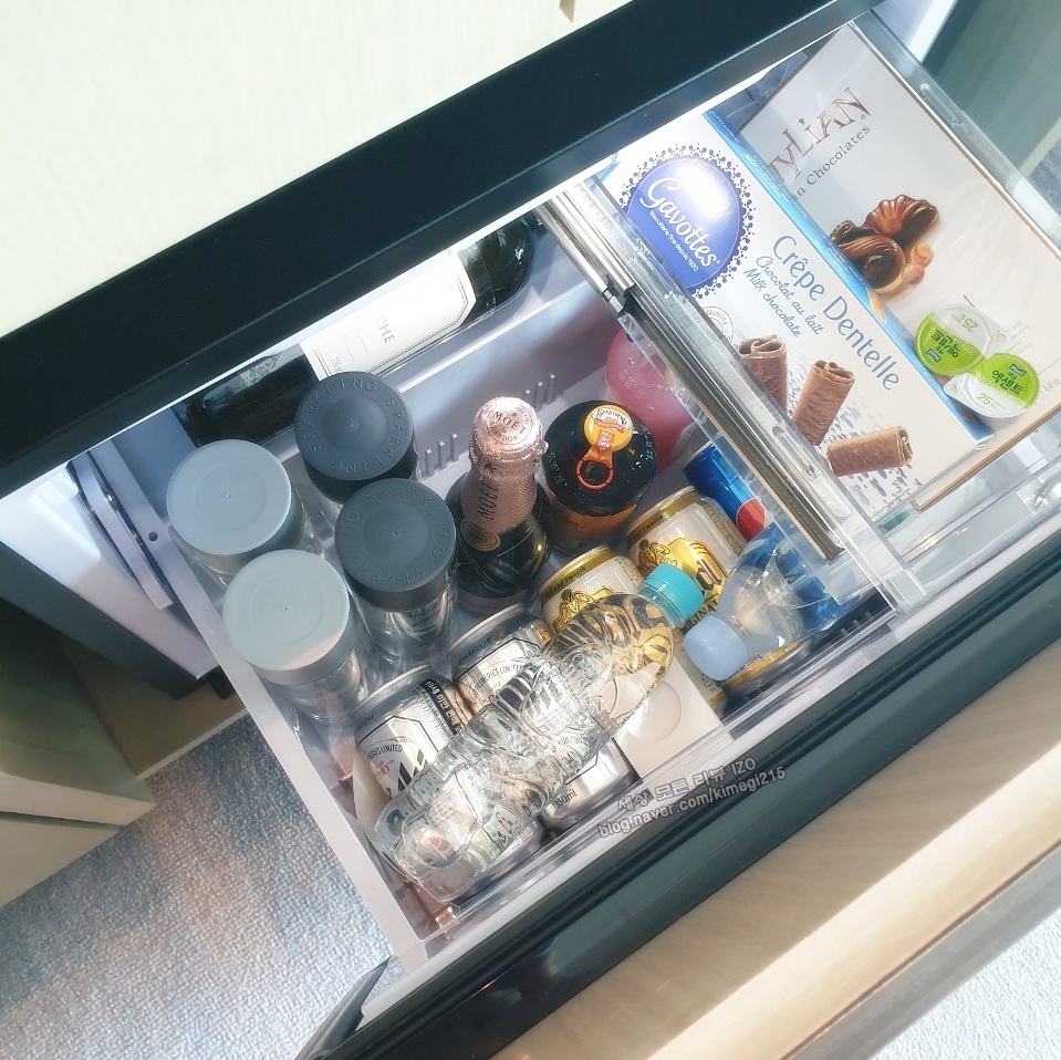 커피 캡슐과 차, 에비앙 생수는 무료로 드실 수 있습니다. 다른 주류들과 과자들은 이용 시에 추가 결제가 필요합니다. 계산서에 가격이 적혀 있으니 보시고 이용하셔도 될 것 같아요.