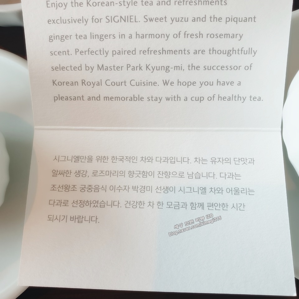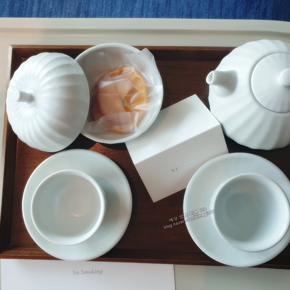 방에 들어오면 직원분이 웰컴 티를 준비해 줍니다. 시그니엘만을 위한 차와 다과로 따뜻한 방에서 바다를 보면서 오늘 하루를 계획해 봅니다. 휴식을 하러 호텔에 왔기 때문에 오늘 하루는 저녁 먹을 때 이외에는 호텔을 나가지 않을 생각이에요. 그렇다고 한가한 게 아니에요. 호텔에서 누려야 할 것들이 많아서 시간이 부족합니다.