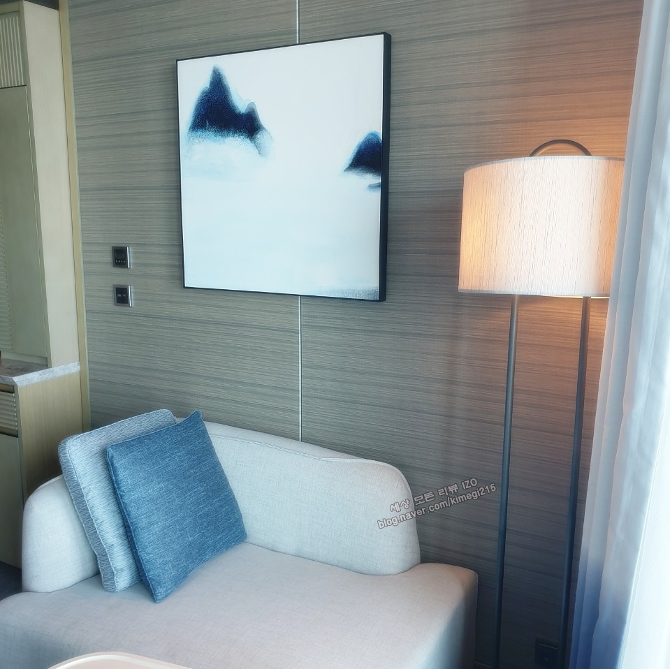 해운대 시그니엘의 디자인은 유명한 디자이너가 했다고 해요. 바다와 하늘 느낌으로 통일해서 베개부터, 휴지 케이스, 커튼, 바닥 , 그림까지 예쁜 바다색으로 되어 있었어요. 부산의 바다 위에 있는 느낌을 받을 수 있었어요.
