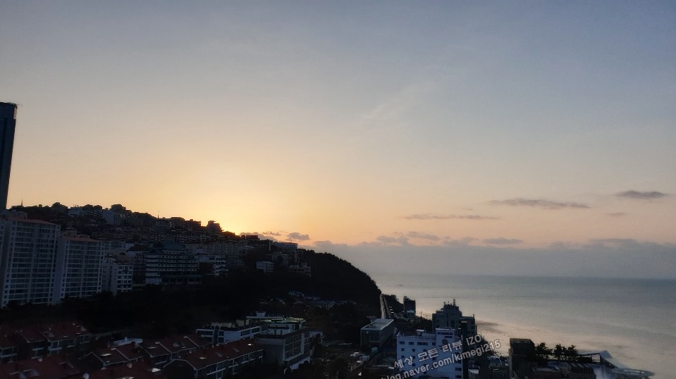 미포항 뷰는 아침에 일출을 볼 수 있습니다. 조식도 먹고 일출도 볼 겸 일찍 일어나서 일출을 보면서 일어났어요. 구름이 껴서 동그란 태양을 보지 못한 게 아쉽네요.