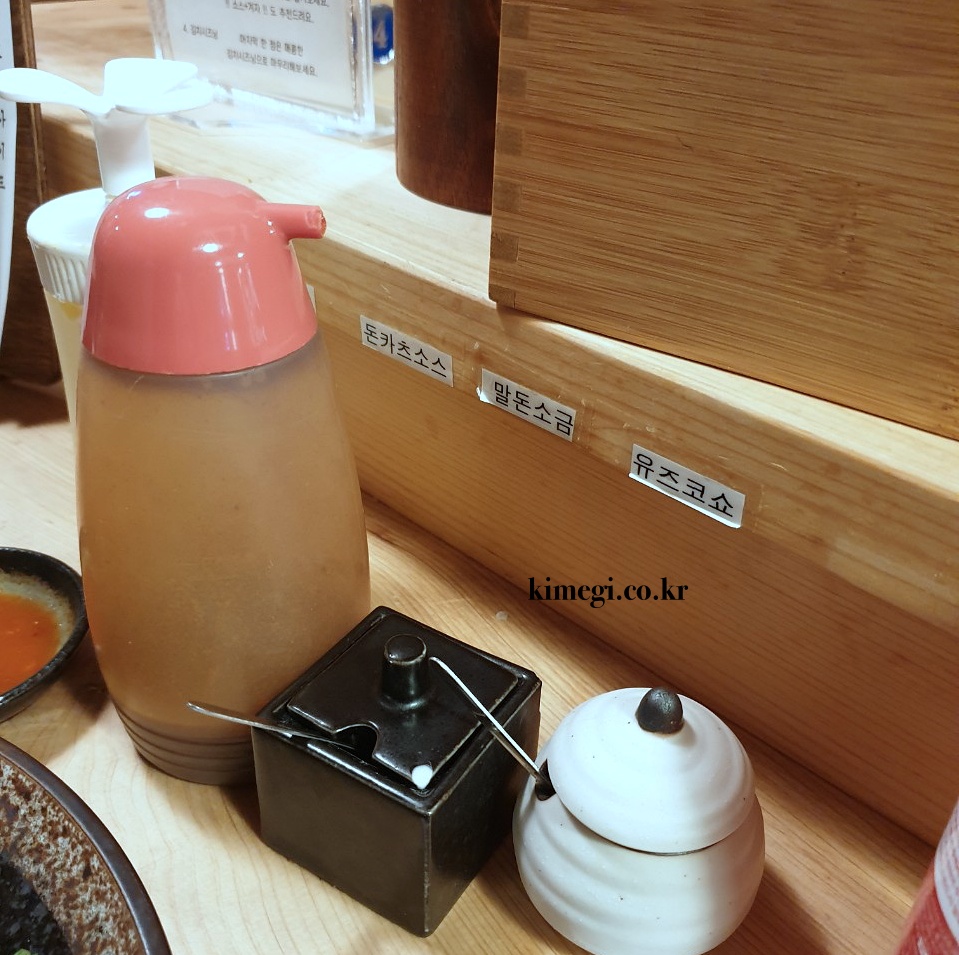 제가 원래 고기를 먹을 때 가장 좋아하는 방법이 소금에만 찍어먹는 거예요. 항상 이야기 하지만 고기의 맛을 가장 잘 느낄 수 있더라고요. 돈카츠도 고기인 이상 소금을 찍어 먹었을 때 가장 맛있습니다. 그리고 찍어먹기보다는 뿌려 먹는 것이 더 좋아요. 톤쇼우 돈카츠의 육즙이 정말 풍부해서 소금을 뿌리자마자 육즙에 녹아서 없어집니다. 소금도 말돈 소금이라고 해서 정말 맛있습니다.