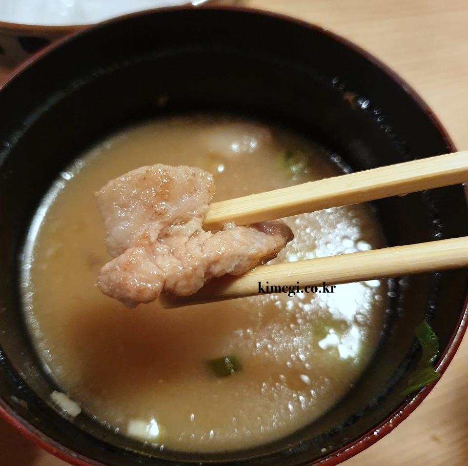 돈카츠와 밥과 함께 된장국도 나왔는데 고기가 들어있어서 너무 맛있었어요. 수프부터 된장국, 샐러드 소스까지 사이드도 정말 맛있는 톤쇼우였습니다. 친구 말 듣고 먹으러 오길 너무 잘했습니다.