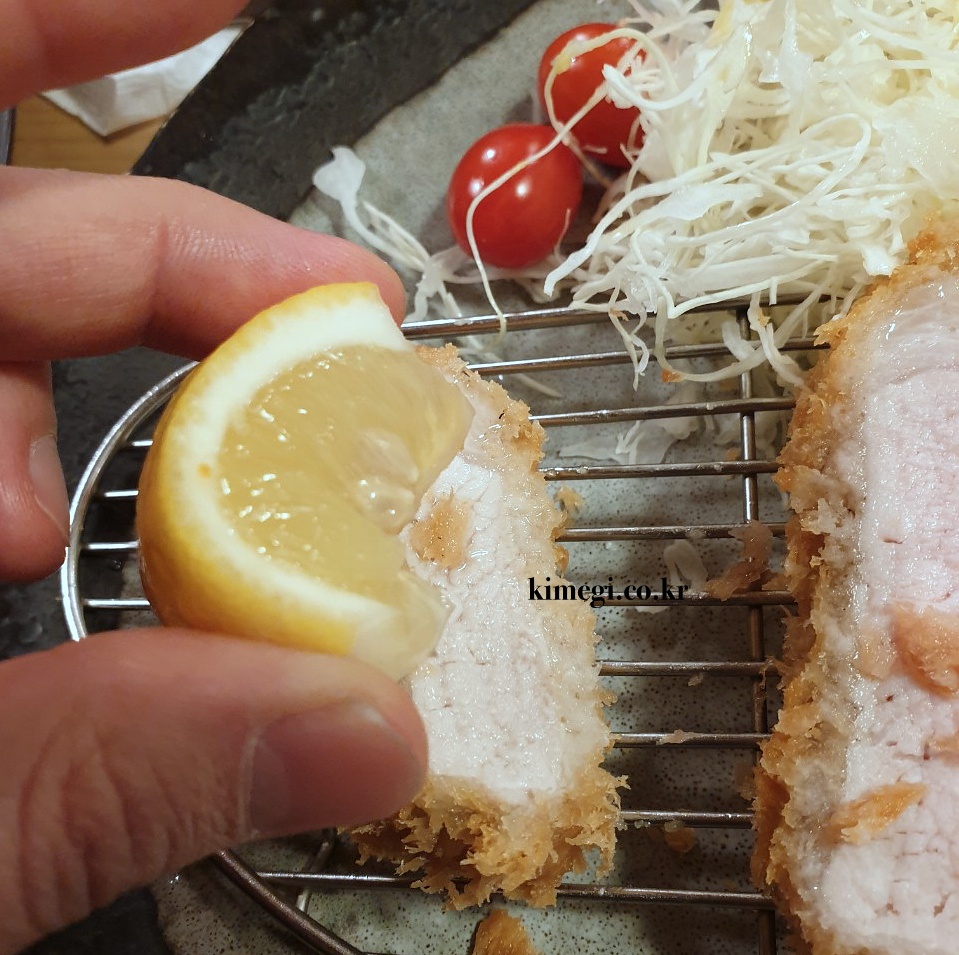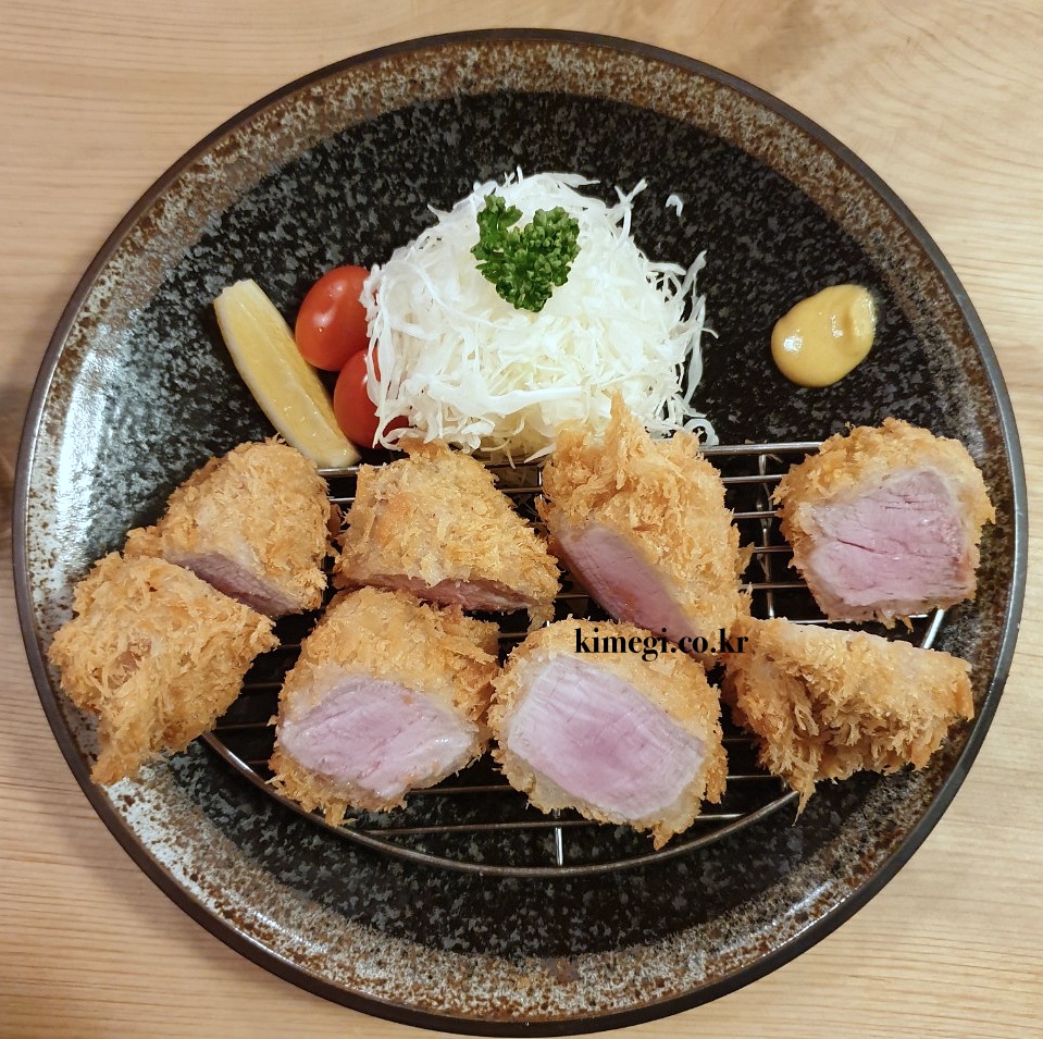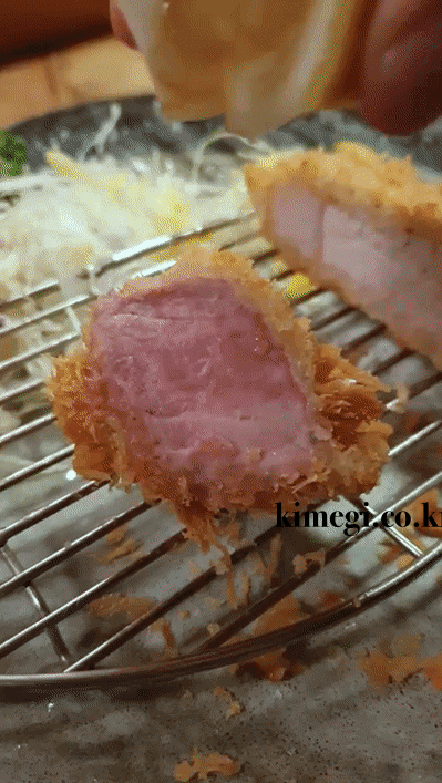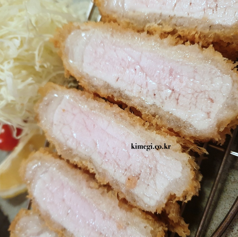 보기만 해도 정말 먹음직스러운 등심 돈카츠입니다. 기름기 풍부한 육즙이 고기를 입에서 녹게 만드는 것 같아요. 대충 찍은 사진에서도 육즙이 넘치는 게 보입니다.