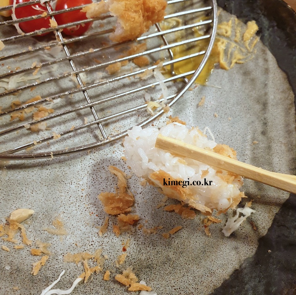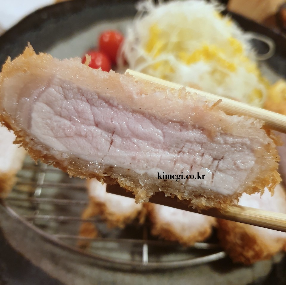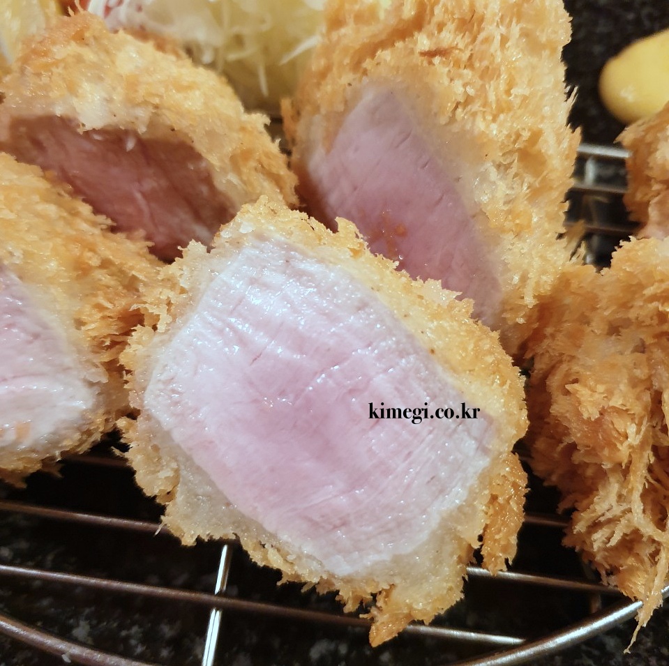 육즙을 가득 머금고 있어서 전혀 퍽퍽하지 않고 부드럽습니다. 기름기는 적고 부드럽고 담백합니다. 튀김옷의 고소함과 정말 잘 어울리는 것 같아요.