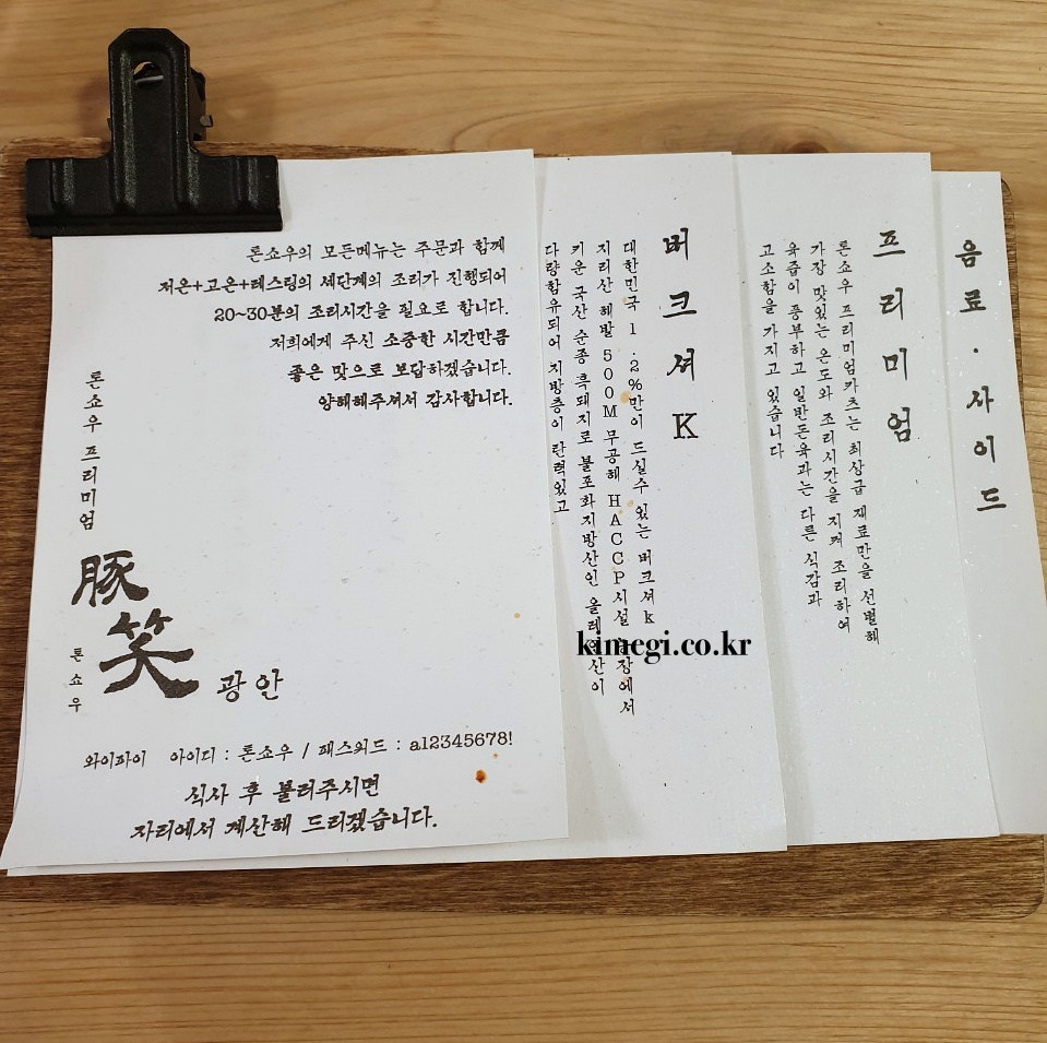 톤쇼우 메뉴판입니다. 지리산에서 키운 흑돼지로 만든 버크셔 K 돈카츠가 조금 더 비싸고 프리미엄 돈카츠는 생각보다 저렴한 편입니다. 이 정도 가격이면 가성비도 정말 좋은 것 같아요.