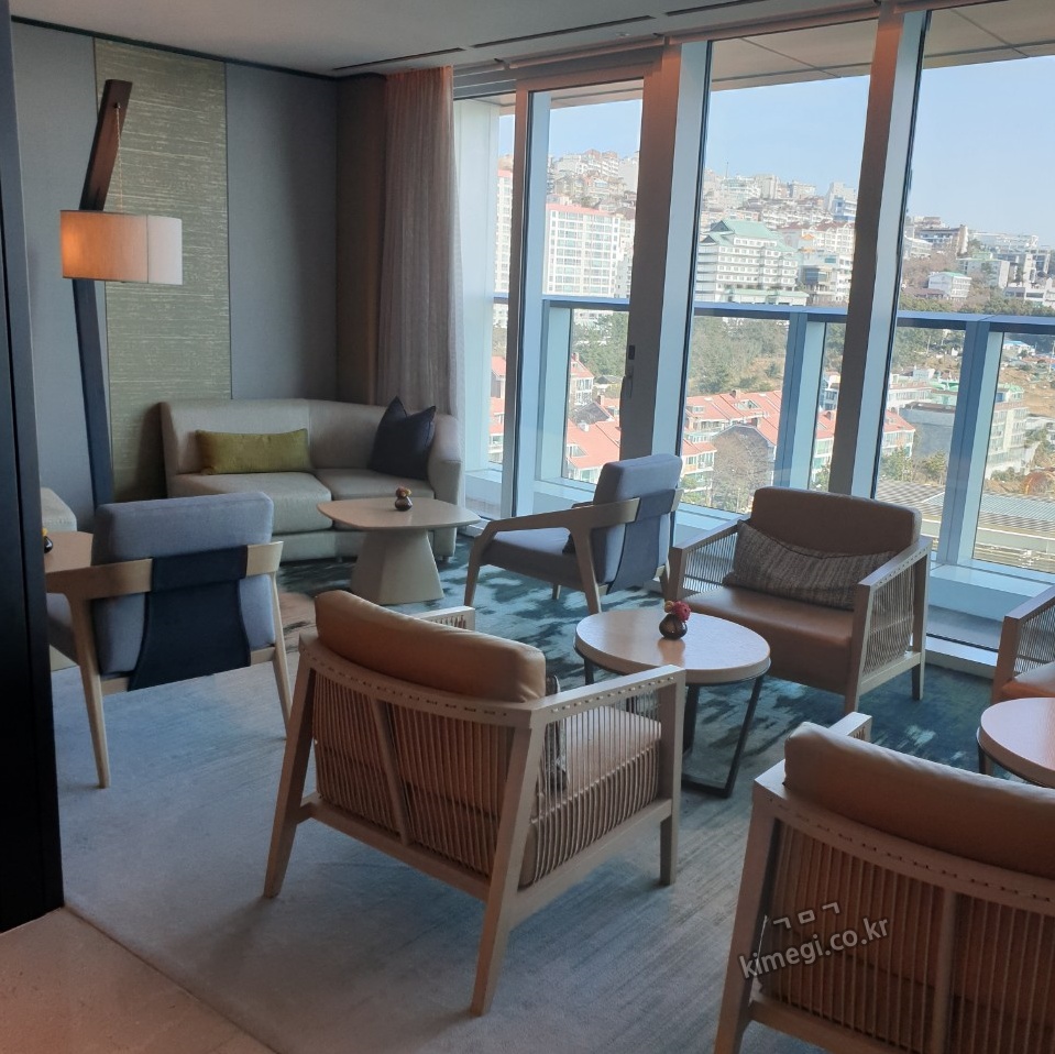 저희는 체크인을 하고 조금 쉬다가 바로 라운지로 갔습니다. 얼리 체크인을 하고 가서 그런지 사람들이 별로 없었어요. 바다가 잘 보이는 곳에 자리를 잡았습니다. 바다는 미포항과 블루라인을 바라보는 뷰입니다.