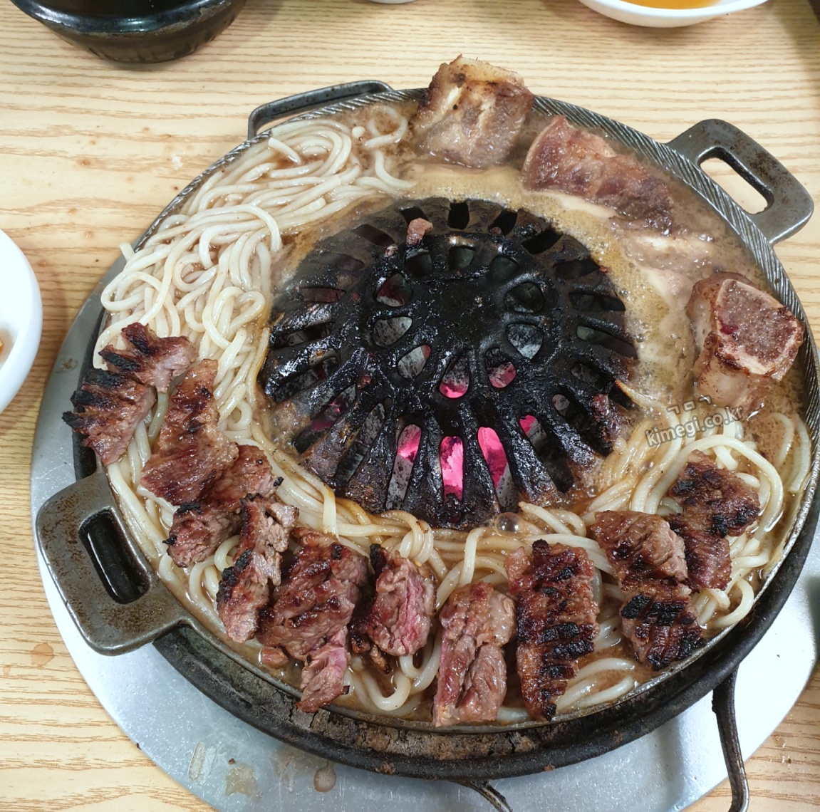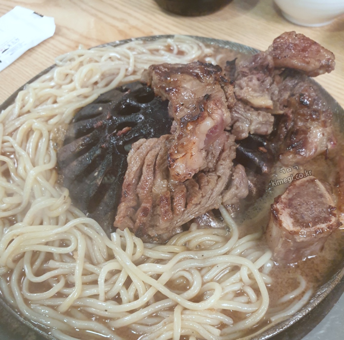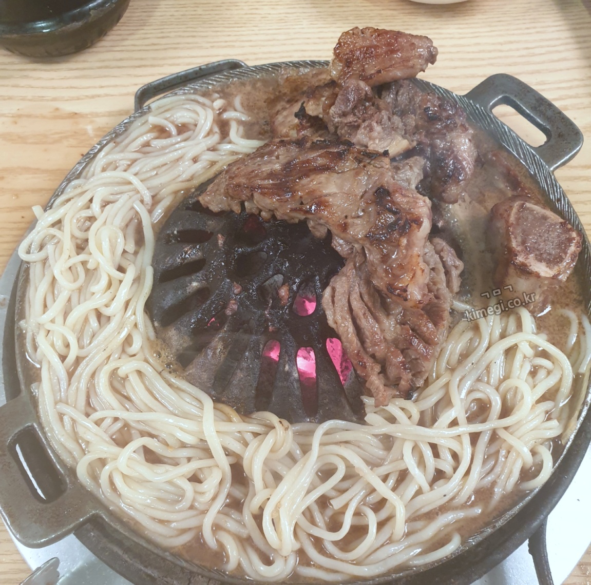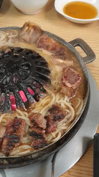 저도 감자사리를 2개 주문했는데 처음 먹었을 때 조금 실망했었어요. 감자 전분의 맛이 너무 많이 나서 뜨거운 냉면을 먹는 느낌이었어요. 그런데 사리가 육수를 다 빨아들이고 점점 익어간 뒤에 먹으니까 진짜 너무 맛있더라고요. 함께 부어준 육수와 양념갈비의 육즙이 섞여서 감자사리에 흡수되어 진짜 너무 특이하면서도 중독성 있는 맛이 됩니다.