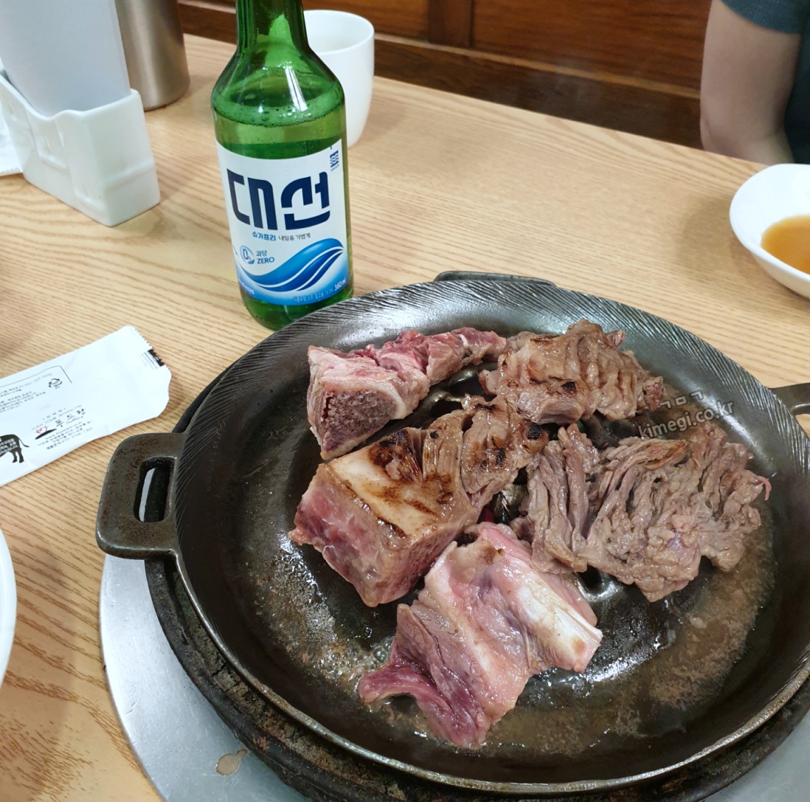 양념갈비는 비싸니까 2인분만 주문하고 공깃밥과 된장찌개, 감자사리를 주문했습니다. 양념갈비는 1인분에 2대로 총 4대가 나왔습니다. 오기 전에 리뷰를 보았는데 친절하지 않다는 말들이 있었는데 무슨 느낌인지 알겠더라고요. 비싼 소고기집의 그런 친절함이 아닌 너무 바빠서 그냥 일을 하시는 느낌이었어요. 하지만 문제가 되는 정도는 아닌 것 같습니다.