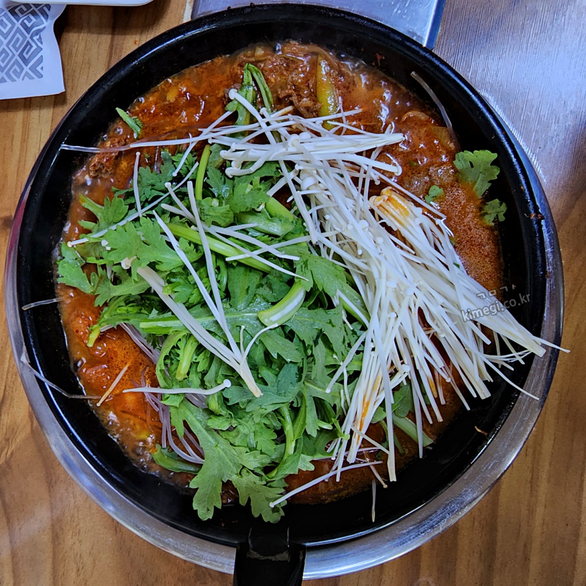 슬슬 고기가 익어가면 쑥갓과 팽이버섯, 당면을 넣어줍니다. 같이 조금 더 익힌 뒤에 먹으면 됩니다. 양념은 섞여서 빨갛게 되었는데 쌀쌀한 날씨에 정말 잘 어울렸어요.