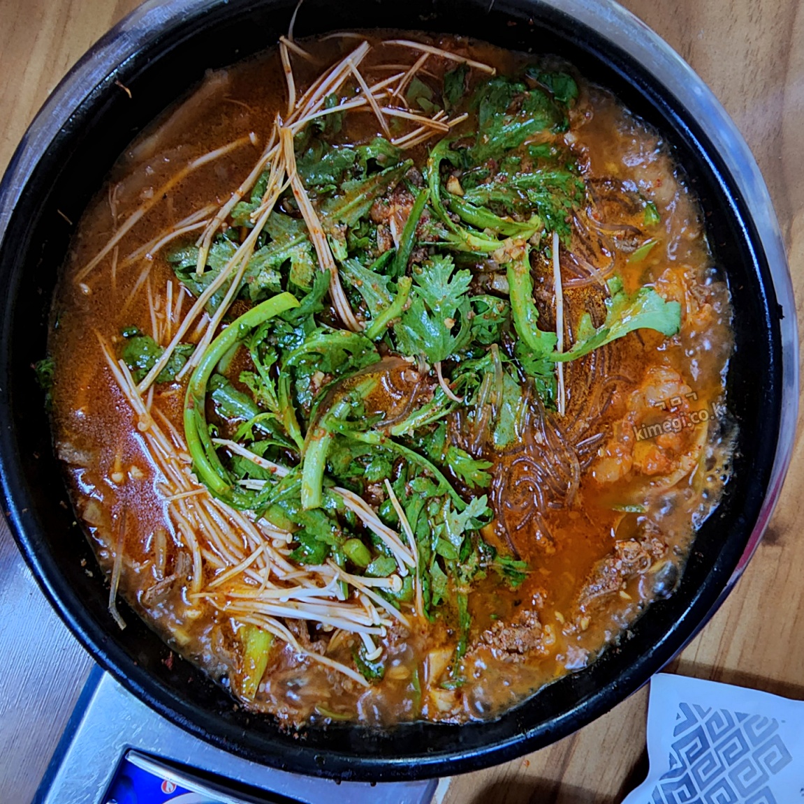 슬슬 고기가 익어가면 쑥갓과 팽이버섯, 당면을 넣어줍니다. 같이 조금 더 익힌 뒤에 먹으면 됩니다. 양념은 섞여서 빨갛게 되었는데 쌀쌀한 날씨에 정말 잘 어울렸어요.