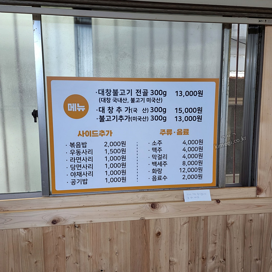 메뉴는 대창 불고기 전골이 1가지만 판매하고 있어요. 대창이나 불고기 추가는 가능합니다. 사이드로는 볶음밥, 각종 사리가 있어요.