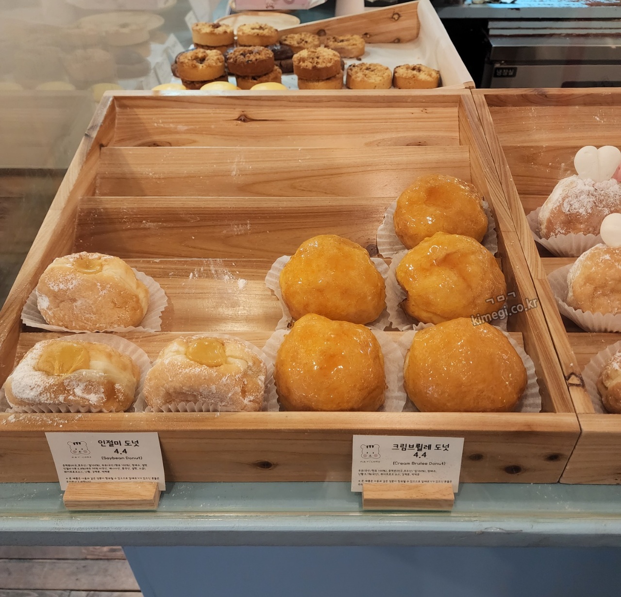 도넛과 함께 다양한 디저트 빵이 있었어요. 메뉴는 여자 친구가 다 골랐습니다. 크림 브륄레, 황치즈쿠키, 생크림 카스텔라 도넛, 애플 크럼블 쿠키를 골랐습니다. 베스트 메뉴인 크림 브륄레만 먹고 가고 나머지는 포장을 했어요.