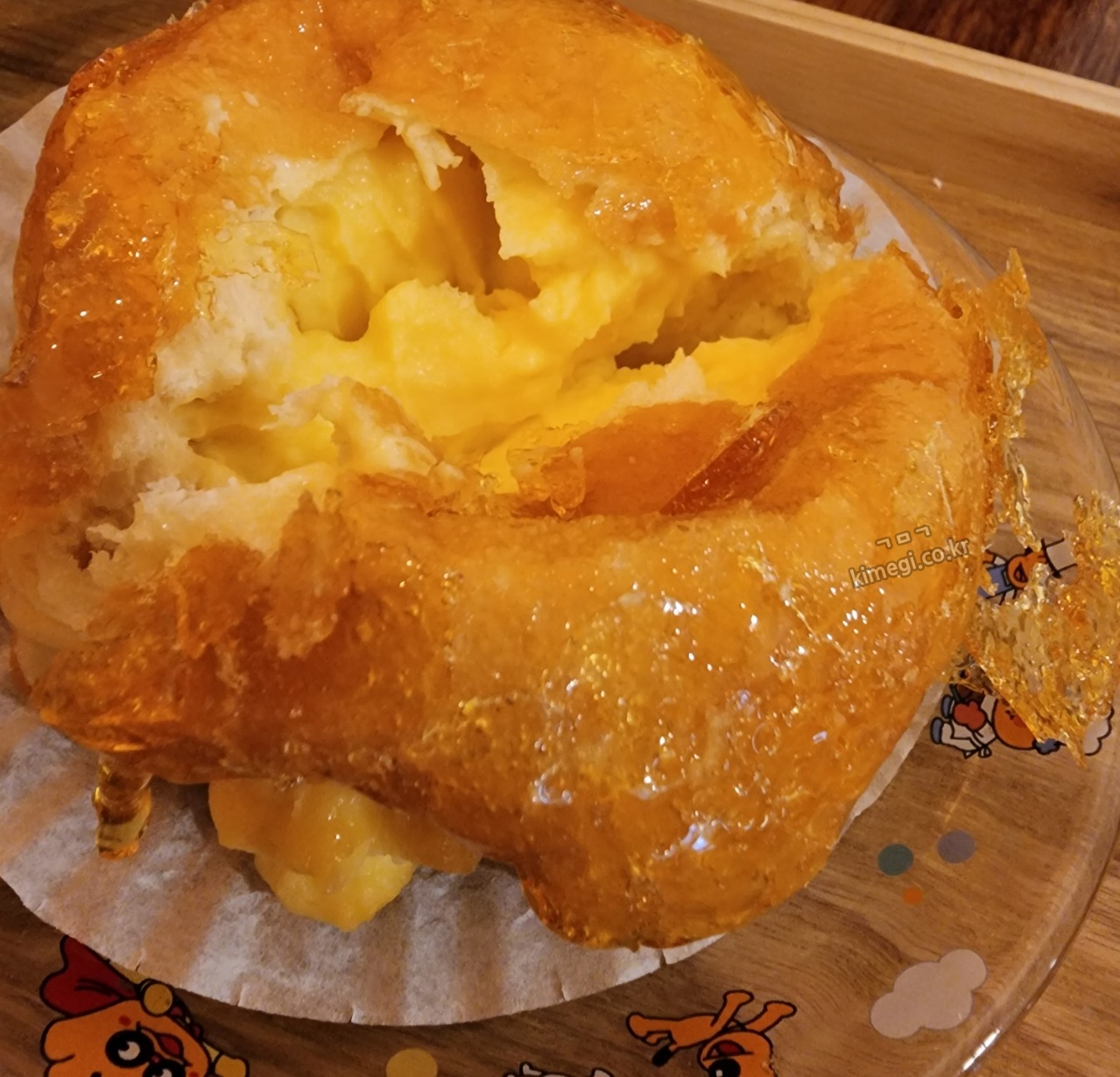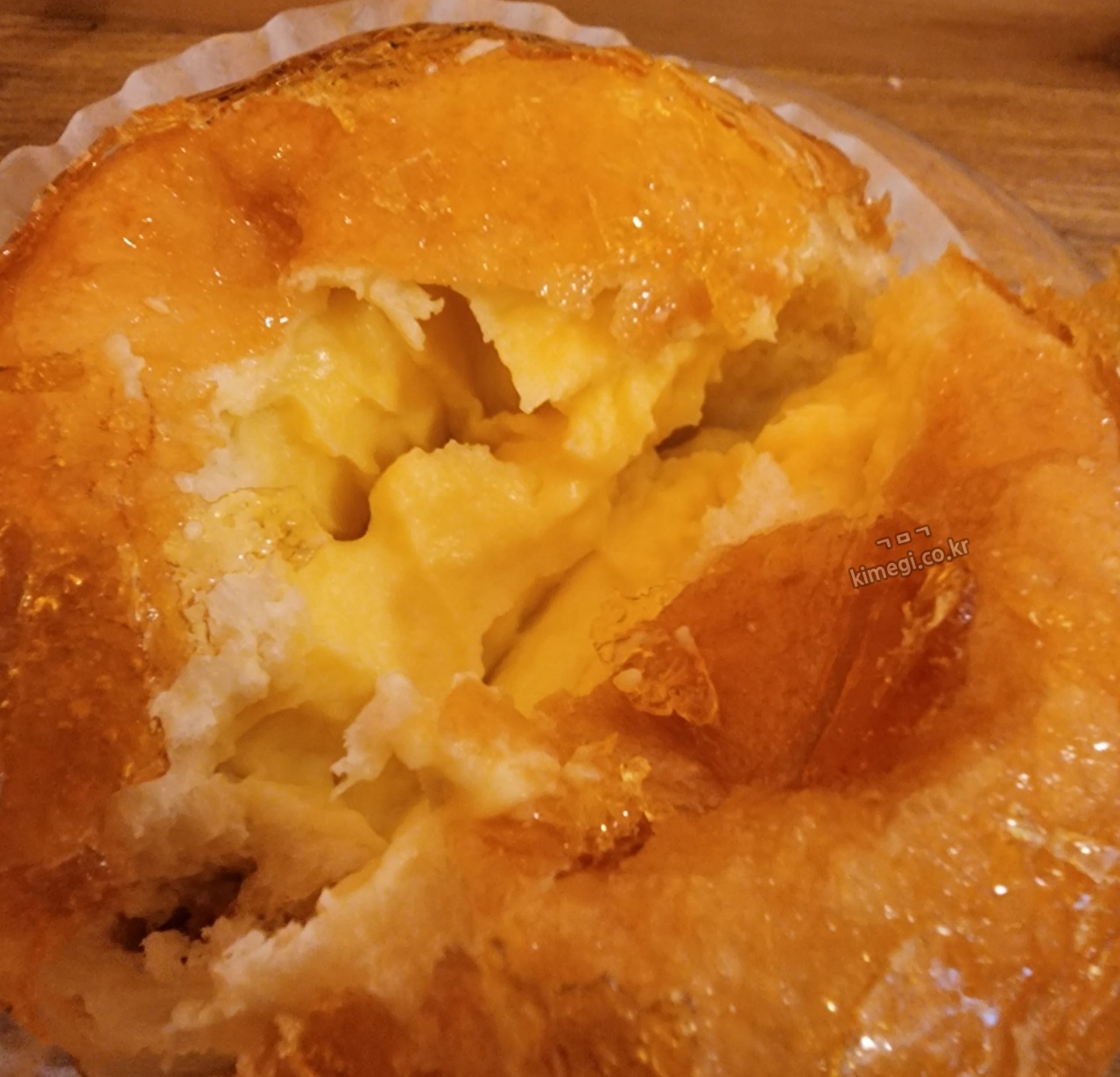 바삭한 설탕 밑에 쫀득한 빵과 그 안에 부드러운 크림이 들어있는 크림 브륄레입니다. 나이프도 함께 주었는데 그 이유는 빵이 정말 쫀득해서 그래요. 그래서 식감이 정말 재미있습니다. 바삭한 설탕과 쫀득한 빵을 함께 먹으면 너무 맛있습니다.