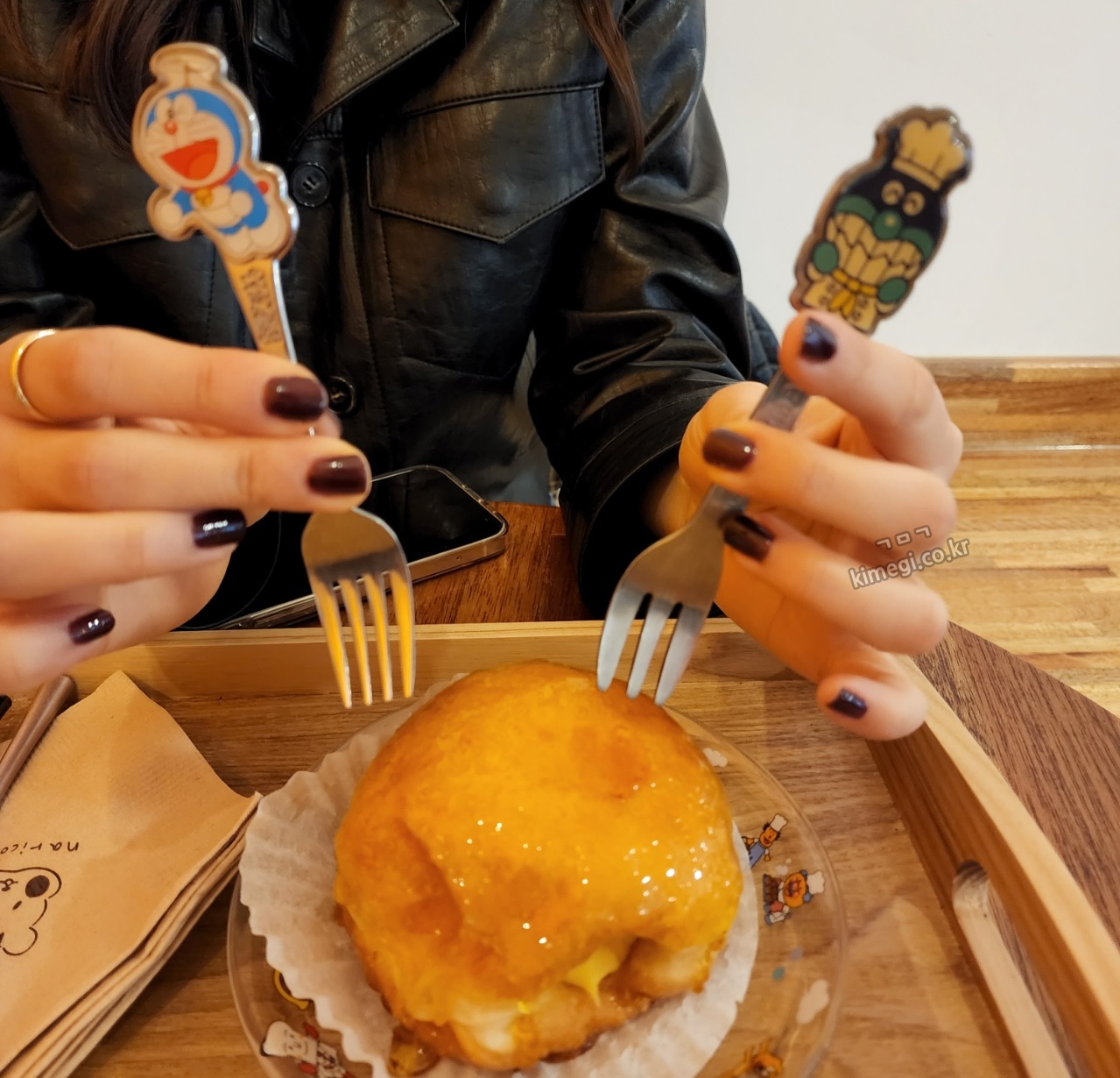 크림 브륄레 도넛과 함께 캐릭터 포크도 같이 왔어요. 물컵부터 포크, 접시까지 모두 귀여운 소품들로 넘쳐나는 대구 맛집 나리꼬모 입니다. 데이트하러 오기도 정말 좋을 것 같아요.