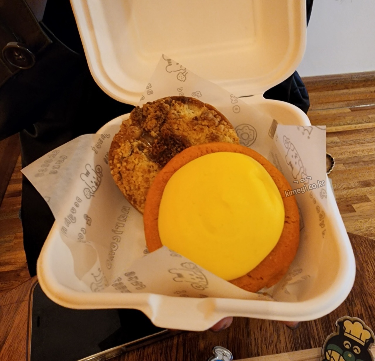 애플 크림블 쿠키와 황치즈 쿠키인데 정말 맛있습니다. 황치즈 쿠키는 뽀또 맛인데 쫀득쫀득해서 너무 맛있었어요. 그리고 제가 가장 좋아했던 메뉴는 애플 크림블 쿠키입니다. 시중에 파는 과자 중에 이런 맛이 있었던 것 같기도 한데 진짜 맛있었어요. 지금 생각해보면 더 많이 사 왔으면 좋았겠다고 생각하는 나리꼬모 메뉴입니다.