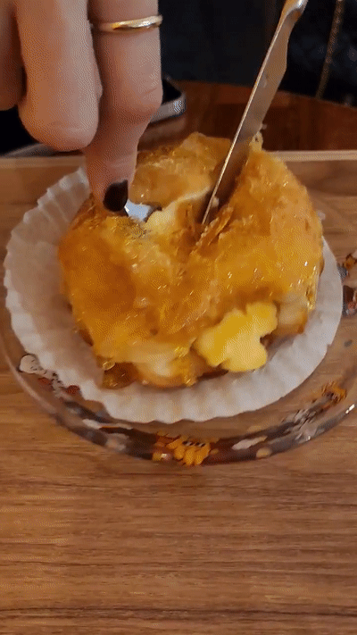 바삭한 설탕 밑에 쫀득한 빵과 그 안에 부드러운 크림이 들어있는 크림 브륄레입니다. 나이프도 함께 주었는데 그 이유는 빵이 정말 쫀득해서 그래요. 그래서 식감이 정말 재미있습니다. 바삭한 설탕과 쫀득한 빵을 함께 먹으면 너무 맛있습니다.