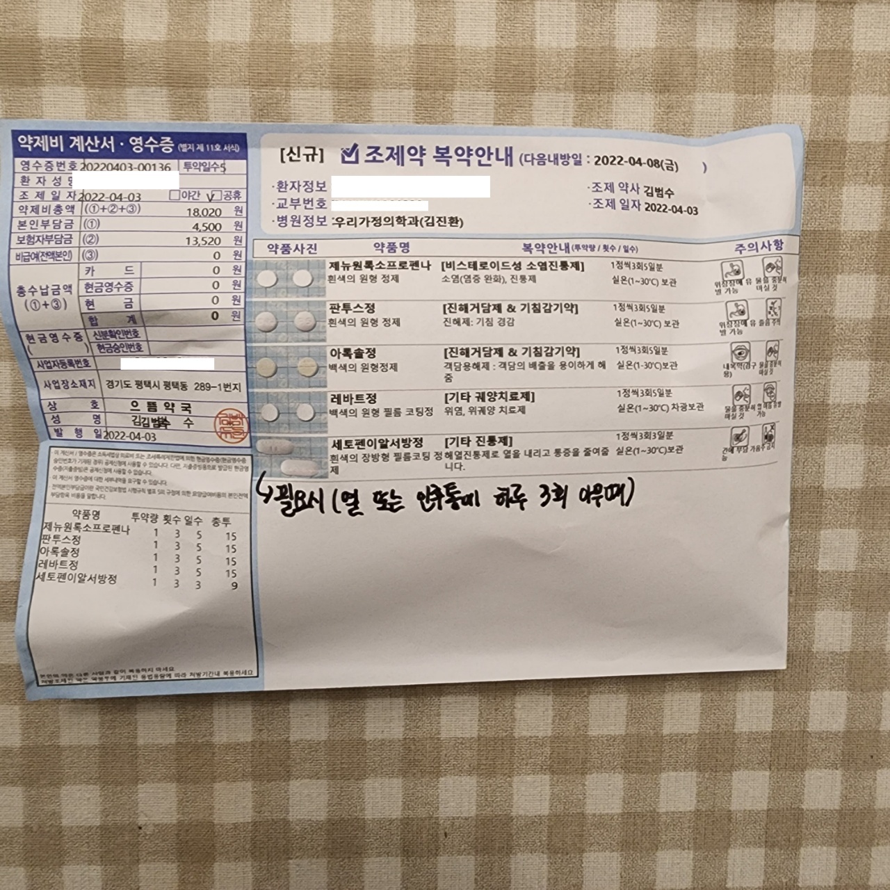 약은 소염진통제, 기침감기약, 위염치료, 기타 해열 및 진통제로 구성되어 있었어요. 하루에 3회 복용하면 된다고 합니다. 약을 꼬박꼬박 잘 챙겨먹어서 그런지 4일 정도 지나니 몸이 괜찮아 지는 것 같아요. 얼른 집 밖을 나가고 싶네요.