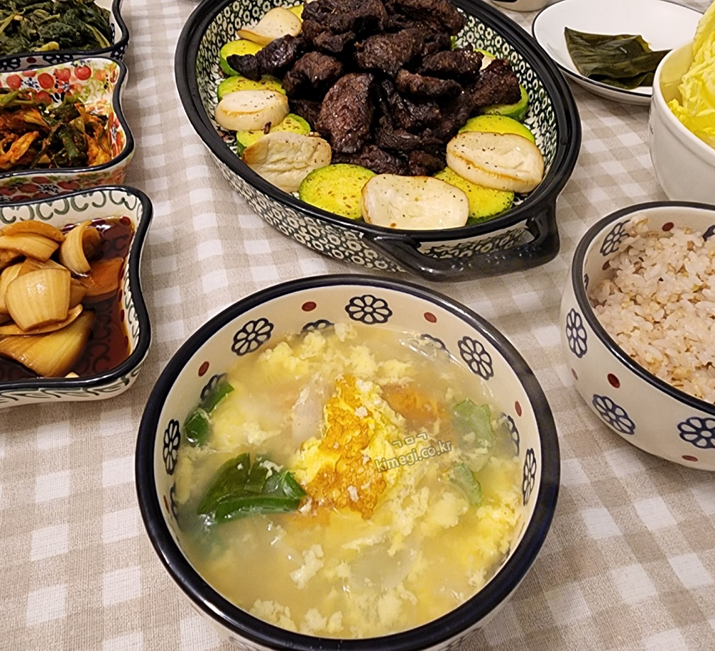 부모님이 주신 반찬들과 함께 상을 차리면 저녁식사가 끝났습니다. 정말 간단히 만들었지만 푸짐한 한상이 되었어요. 고기는 에어 프라이기로 굽고 야채 살짝 굽고 계란탕 후딱 하니까 정말 푸짐해졌습니다.