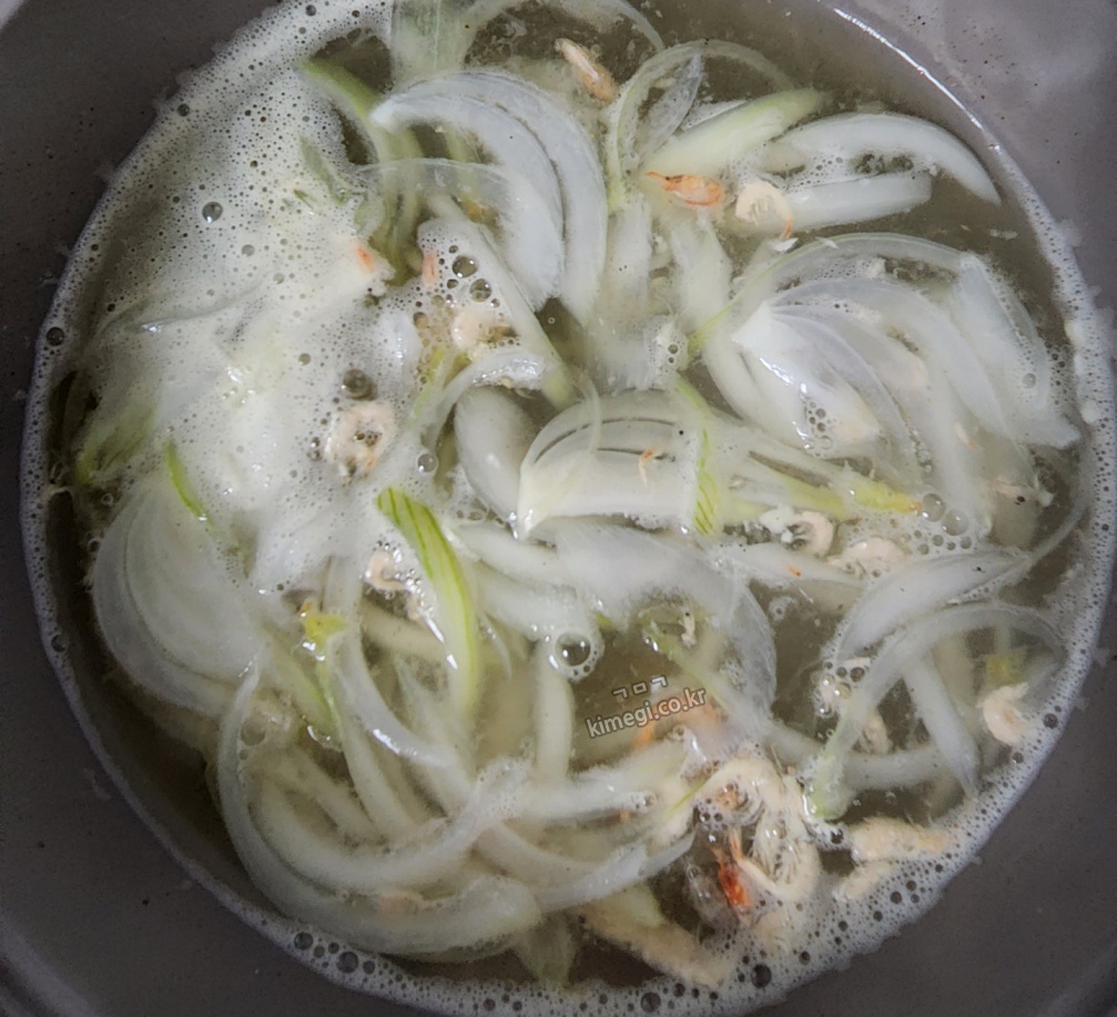 2. 양파를 넣고 새우젓과 국간장으로 간을 해준다. 새우젓으로 간을 해주면 조금 더 맛있는 것 같아요. 새우젓으로 간을 한다고 생각하고 국간장으로 향만 맞춰주면 좋습니다.
