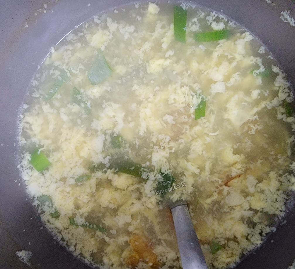 계란을 풀어줄 때 휘저으면 아래처럼 계란이 다 풀어지고 국물이 탁해져요. 물론 맛은 좋지만 보기에 좋지 않고 계란의 식감이 많이 사라집니다. 저는 딴생각하다가 계란을 라면에 넣듯이 풀어버렸어요.