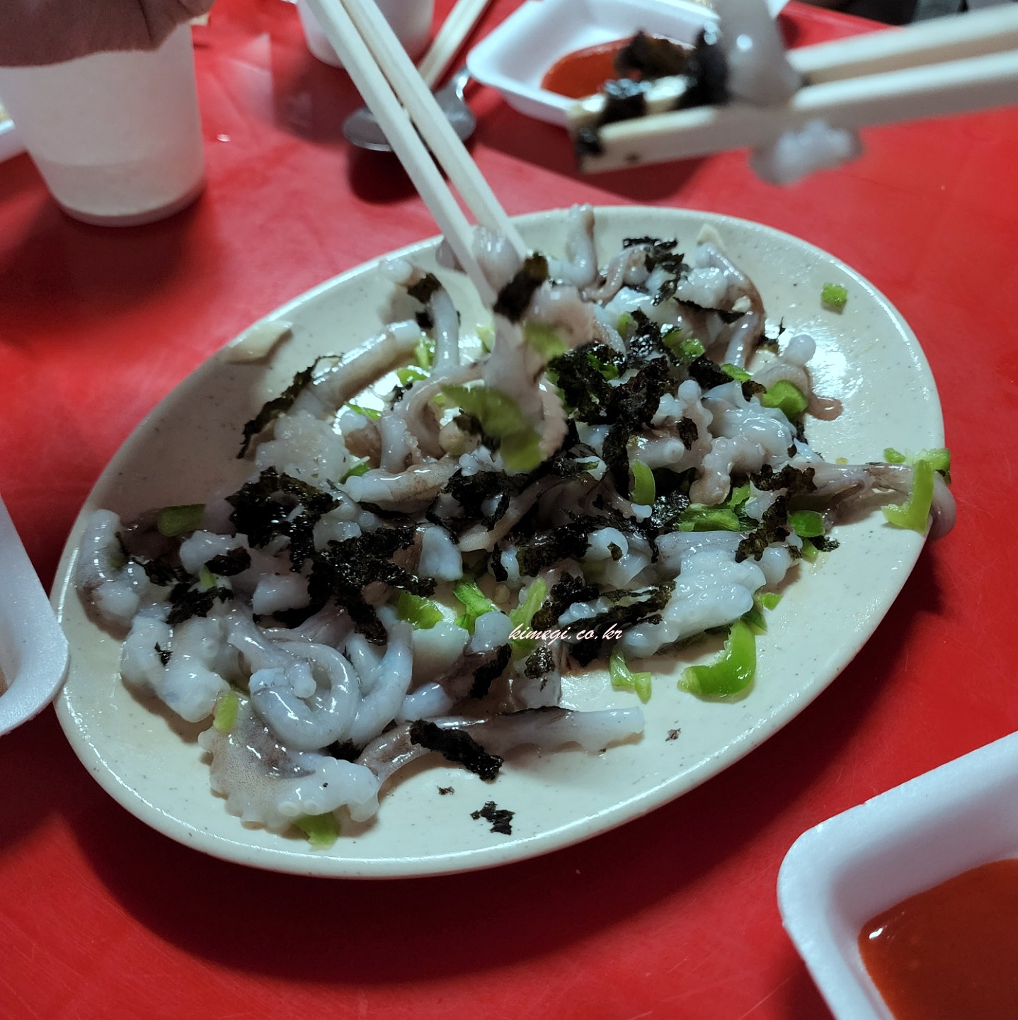포장마차에서도 이렇게 싱싱한 낚지 탕탕이를 먹을 수 있더라고요. 특이한게 김가루를 뿌려서 나오는데 이게 또 은근히 맛있더라고요. 김가루에 참기이랑 소금이 있으니까 간도 되고 맛있었어요.
