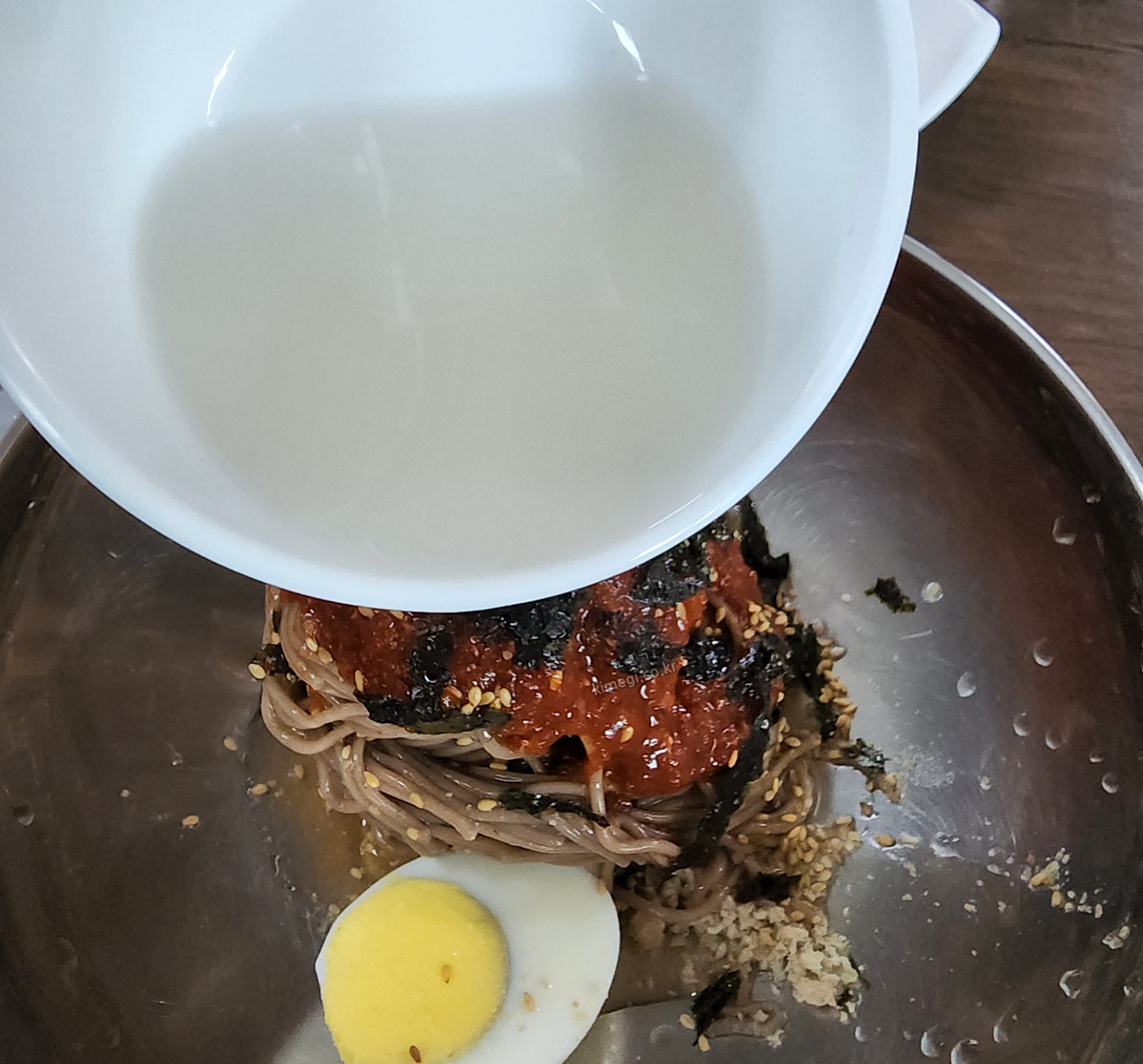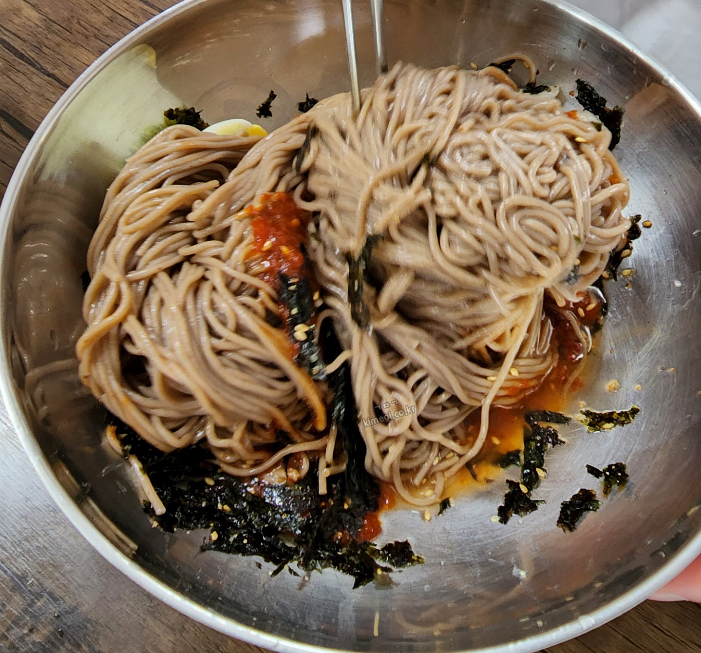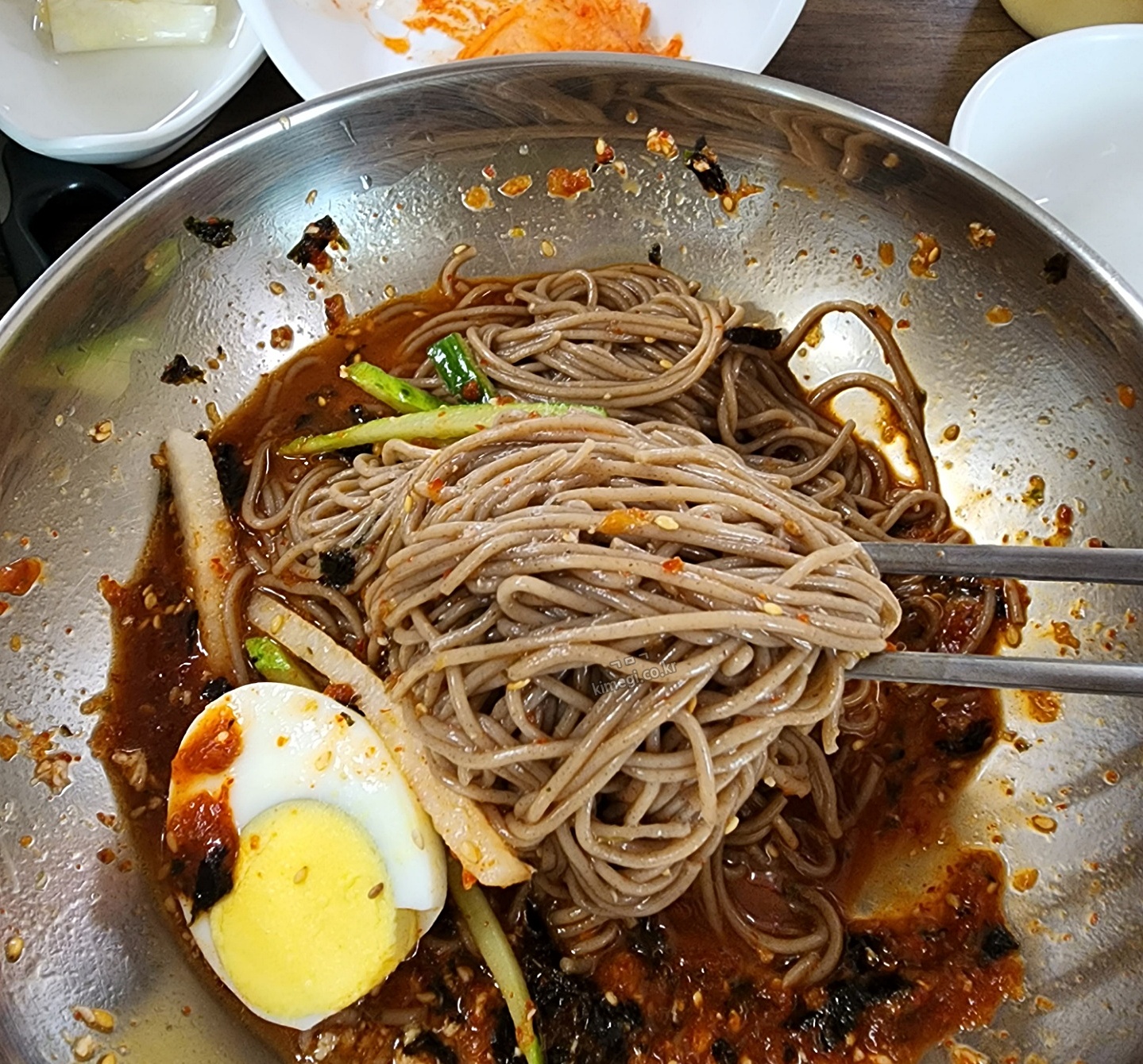 동치미 육수를 부어준 뒤에 맛있게 비벼줍니다. 메밀면의 툭툭 끊어지는 식감도 너무 좋았고 메밀향이 너무 좋았습니다. 그래도 심심한 맛보다는 자극적인 비빔이 훨씬 좋은 것 같아요. 저희가 비빔용 육수를 계속 추가했는데 아예 큰 컵에 주시더라고요. 정말 친절한 사장님이셨어요.