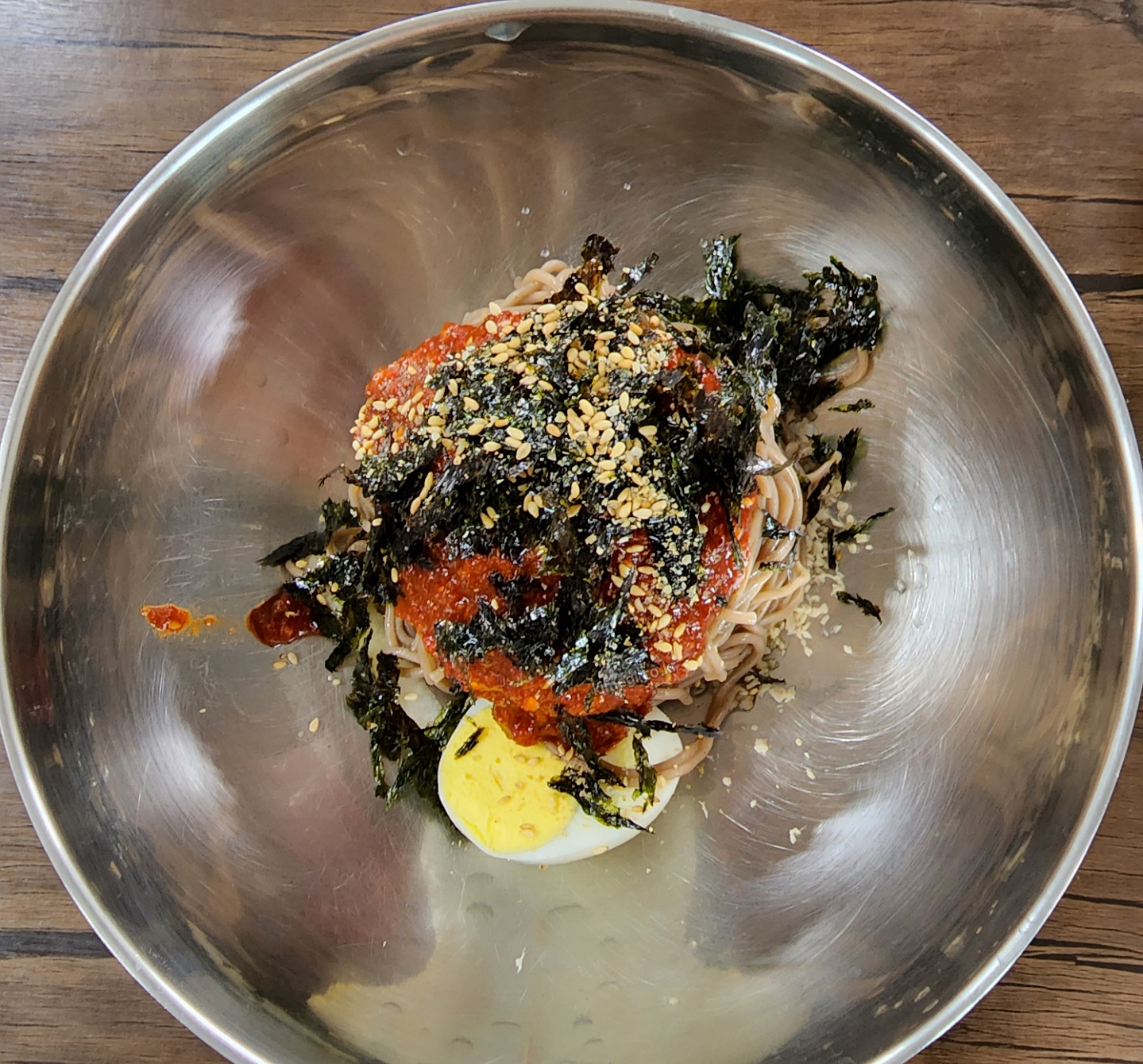비빔 막국수가 나왔습니다. 김가루와 깨가 뿌려진 막국수가 정말 맛있어 보입니다. 따뜻한 국물이 먹고 싶었는데 시원한 막국수도 해장으로 너무 좋았습니다.
