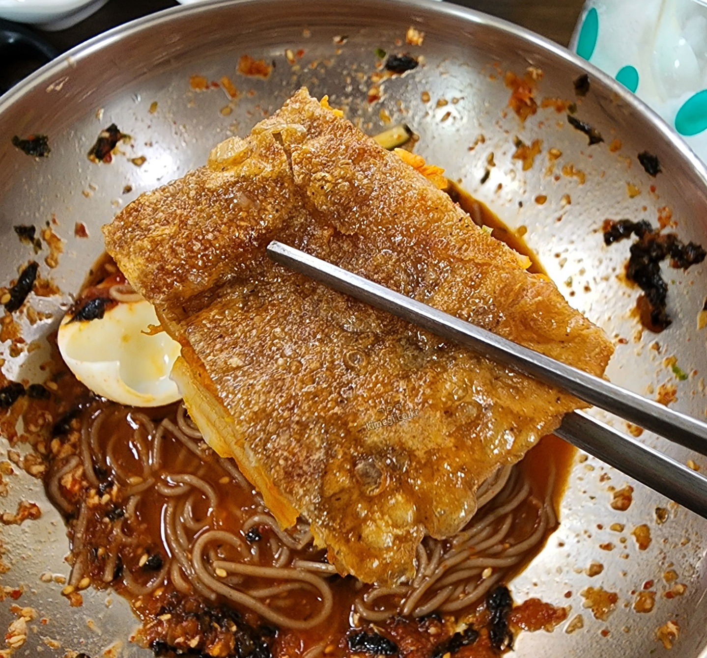 속은 만두 속이랑 비슷한 것 같은데 전병 피가 바삭바삭하면서 너무 맛있었어요. 제가 거의 반을 먹은 것 같아요. 군만두를 먹는 것 같기도 하면서 메밀 피가 튀겨지니까 너무 맛있었어요. 찐만두보다는 튀긴 메밀전병을 정말 추천합니다. 저희가 왔을 때는 사람이 별로 없었는데 시간이 지나니까 손님이 정말 많이 왔어요. 아마 다들 퇴실하고 밥을 먹으러 온 것 같은데 정말 맛집 막국수 집이었습니다. 비빔 막국수도 맛있고 메밀 전병도 정말 맛있습니다.