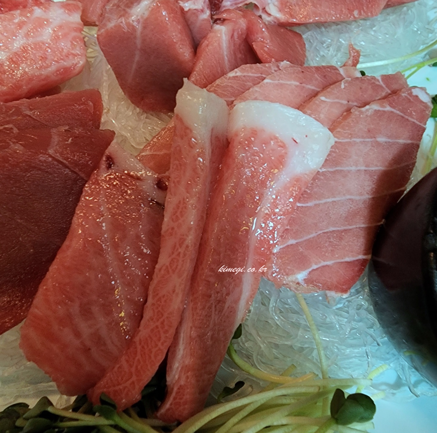 리필하는 참치도 이렇게 양이 많고 부위가 바뀌지 않아요. 초반에는 소금이나 간장에 찍어서 먹다가 양이 너무 많고 조금 느끼해서 나중에는 김에 싸 먹게 되더라고요. 해방 일지에서 참치는 김에 싸 먹는 게 아니라고 하지만 어쩔 수 없습니다. 참치를 한 점이라도 더 먹으려면 김이 필수입니다.
