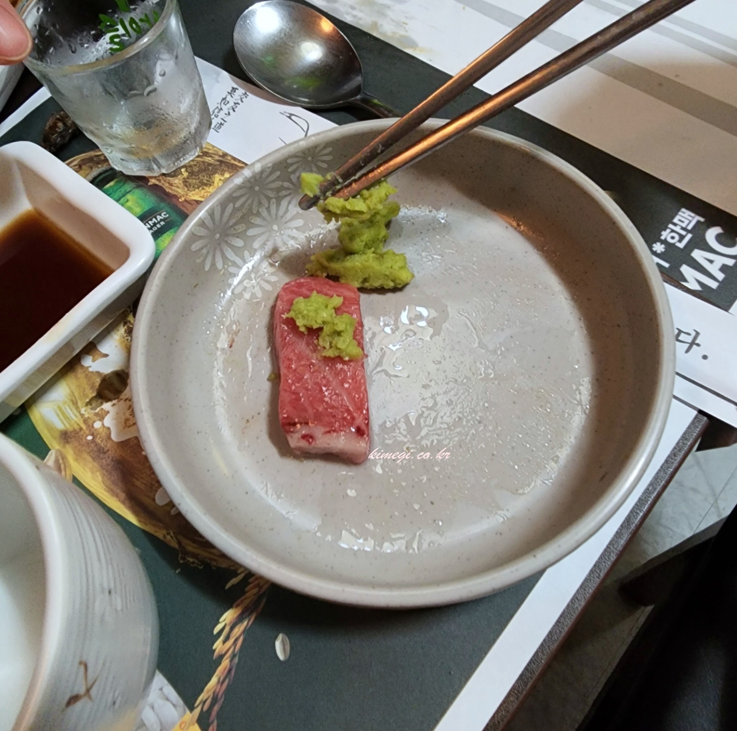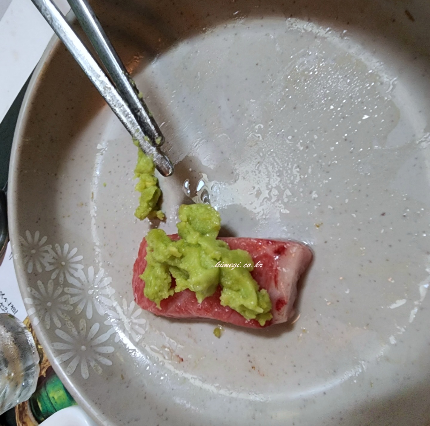 기름기가 많아서 고추냉이를 많이 얹어서 먹어도 맵지 않고 더 맛있더라고요. 물론 아래 사진처럼 먹으면 죽습니다.