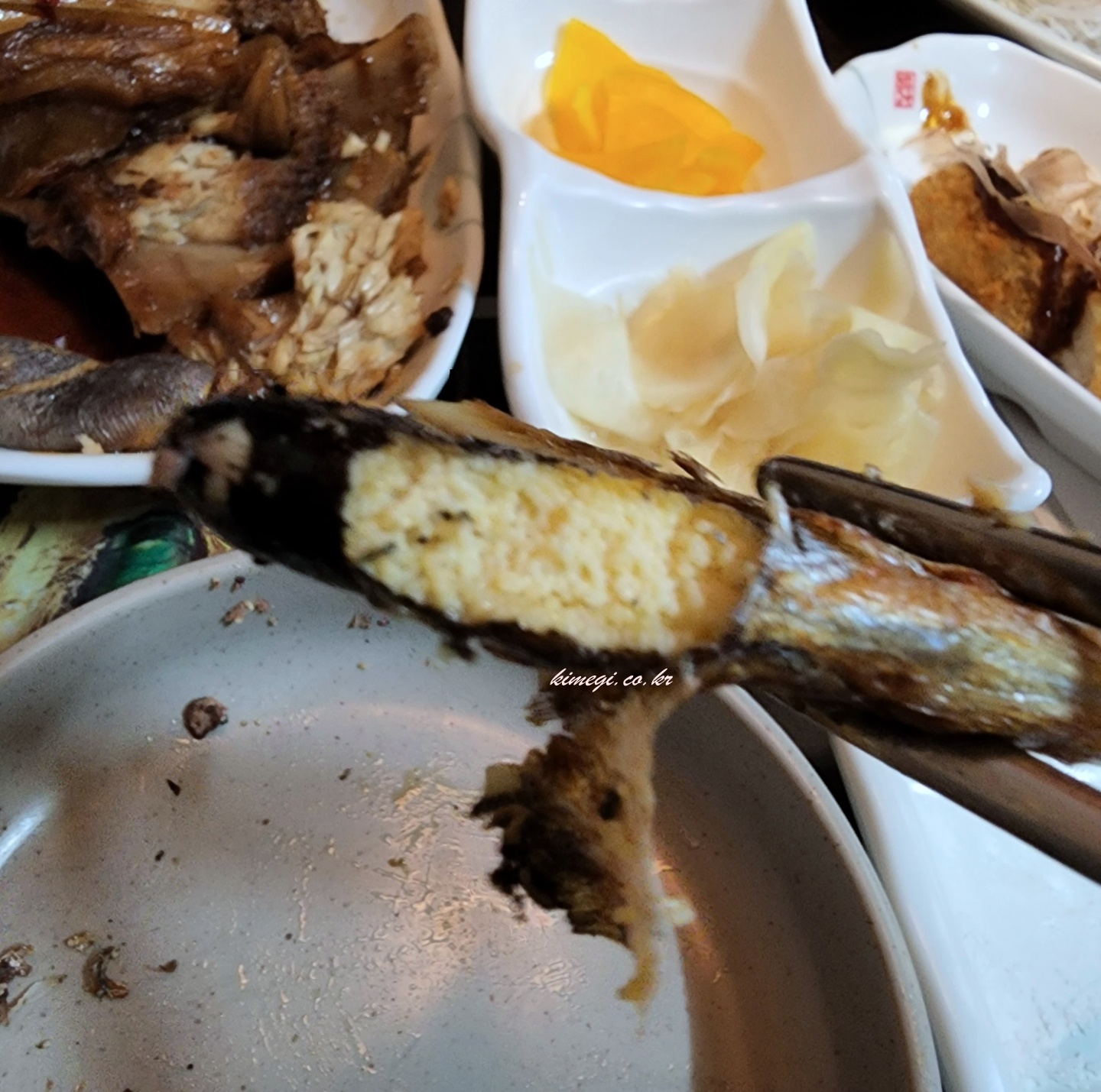한 번에 다 나오는 것이 아니라 먹으면서 틈틈이 가져다주십니다. 생선찜과 생선 튀김은 다 참치로 만들었다고 해요. 절대 참치를 많이 먹지 말라고 주는 밑반찬이 아니라 맛있게 같이 먹을 수 있도록 만들어 주신다고 하더라고요. 참치 찜, 참치 탕수육, 새우튀김 전부 너무 맛있었어요. 그리고 빙어 구이가 진짜 너무 맛있더라과요. 알이 꽉찬 빙어구이가 너무 맛있었어요.