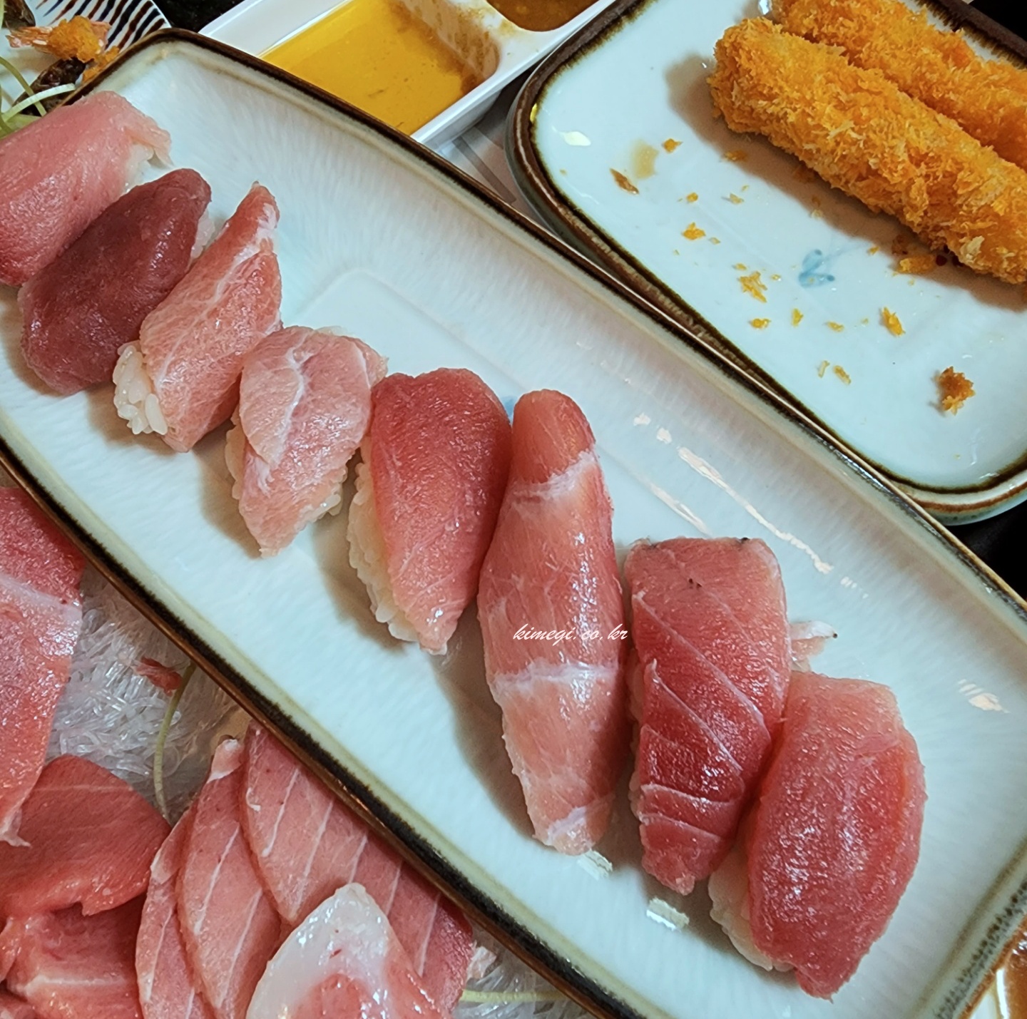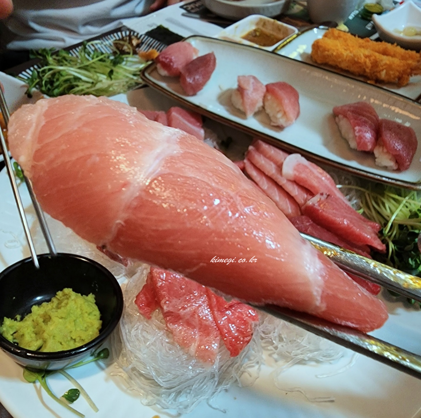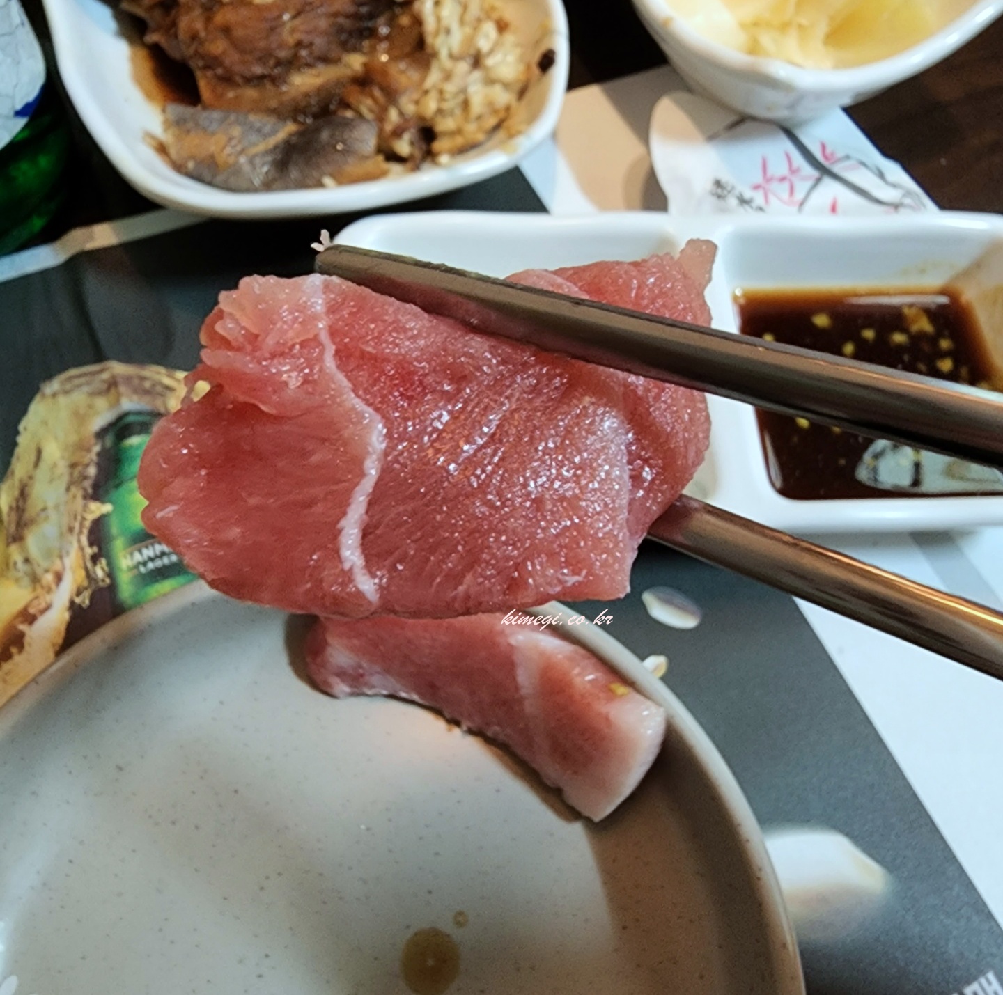 리필하는 참치도 이렇게 양이 많고 부위가 바뀌지 않아요. 초반에는 소금이나 간장에 찍어서 먹다가 양이 너무 많고 조금 느끼해서 나중에는 김에 싸 먹게 되더라고요. 해방 일지에서 참치는 김에 싸 먹는 게 아니라고 하지만 어쩔 수 없습니다. 참치를 한 점이라도 더 먹으려면 김이 필수입니다.