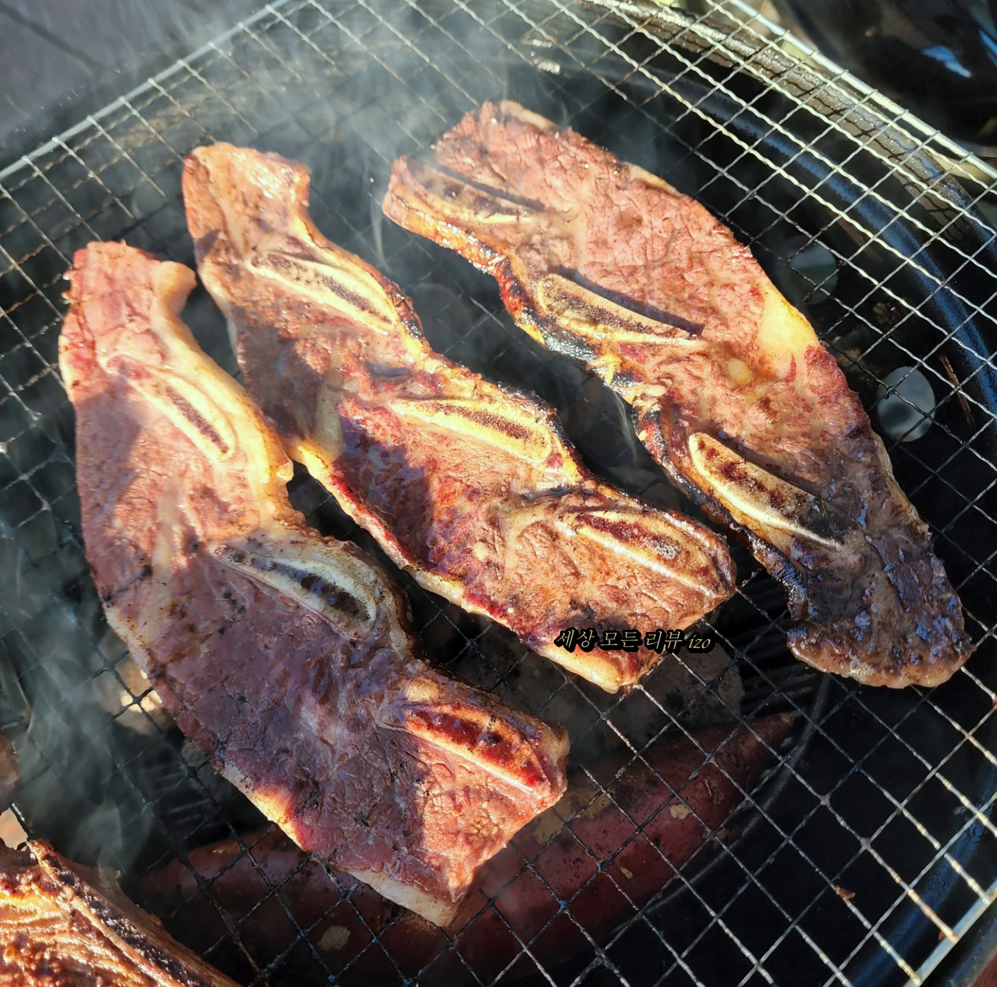 자르지 않고 이렇게 뼈채로 뜯어먹었어요. 진짜 부드럽고 맛있더라고요. 캠핑 가실 때 미리 LA갈비를 구매해서 가져가 보세요. 숯불에 구우니까 생각보다 맛있더라고요. LA 갈비 구매 링크