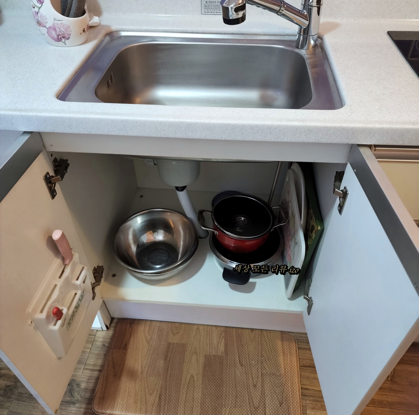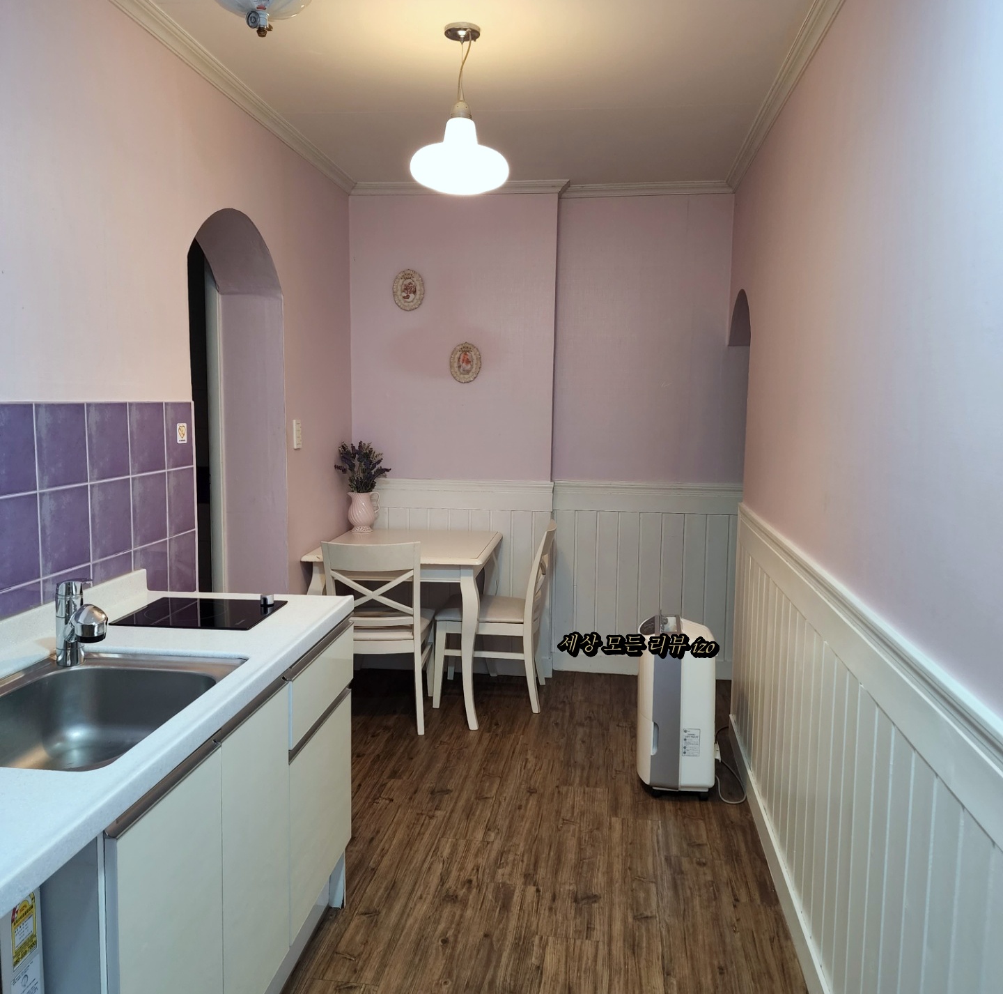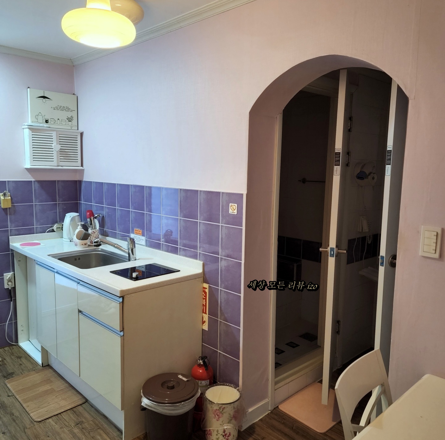 주방은 방과는 분리되어서 따로 있었는데 간단한 요리를 만들어 먹기에는 나쁘지 않습니다. 작은 식탁이 있었지만 저희는 안방에 화장대를 옮겨서 티브이를 보면서 야식을 먹었어요. 식탁은 짐을 올려놓는 용도로 사용하는 것 같아요.