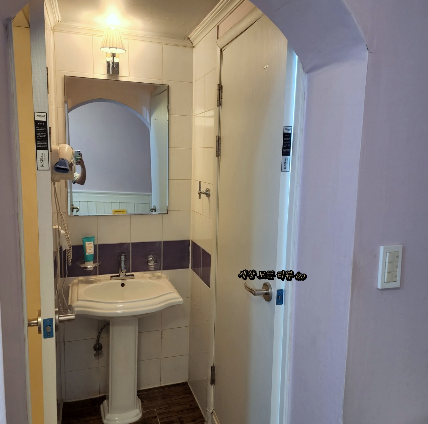 화장실은 가운데 세면대가 있고 좌측에는 사워장, 우측은 변기가 있어서 따로 이용할 수 있게 되어 있습니다. 구조가 특이하지만 깨끗하게 이용할 수 있더라고요.